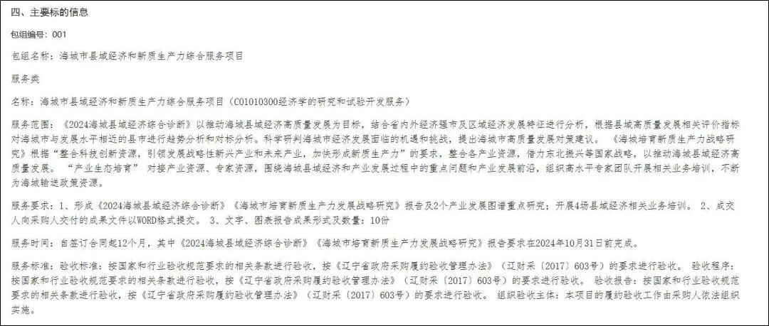 记者通过查询辽宁政府采购网获悉,2024年6月,赛迪顾问股份有限公司以总得分85.42分,中标“海城市县域经济和新质生产力综合服务项目”,中标(成交)金额为498万元。项目采购方为海城市工业和信息化局。