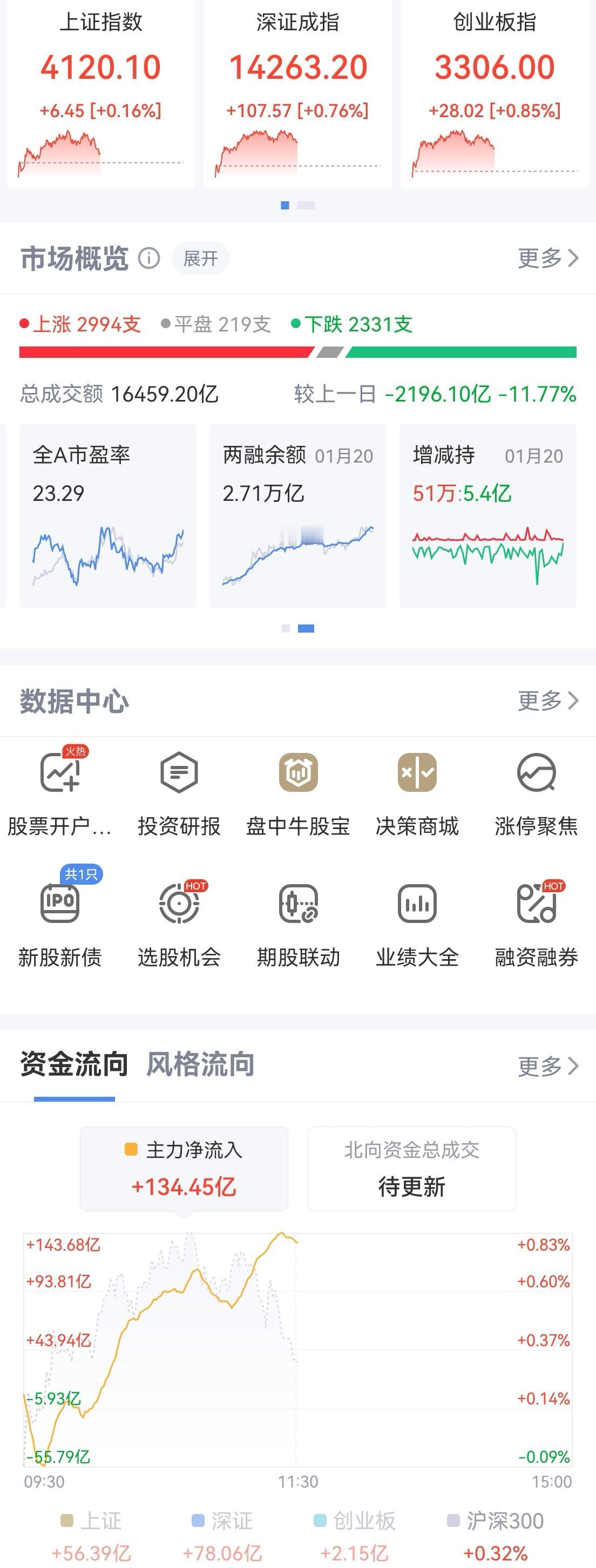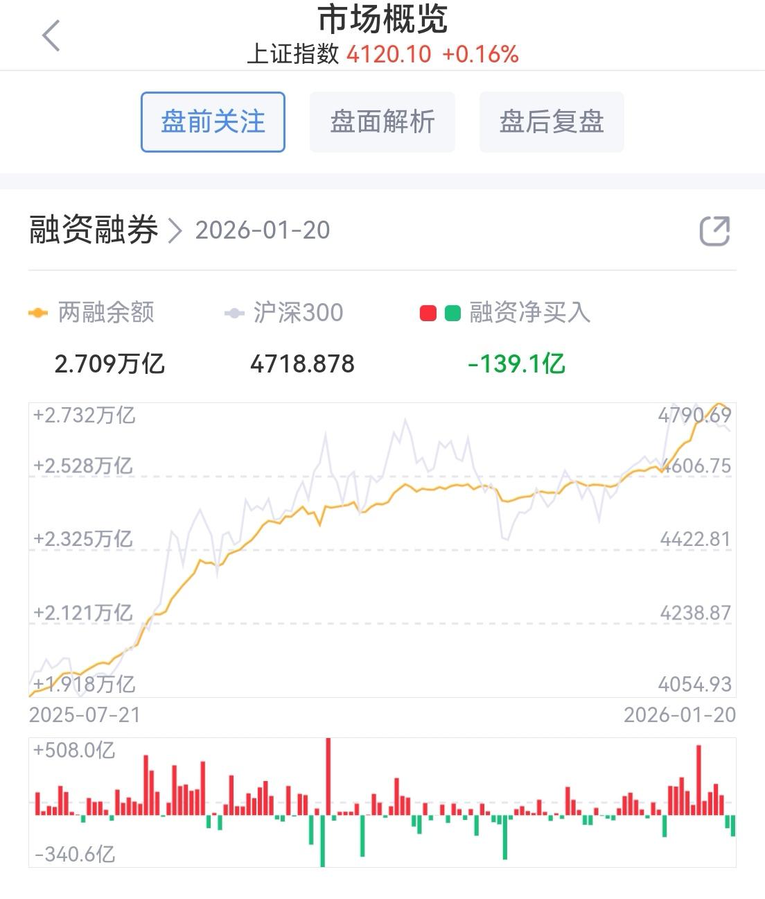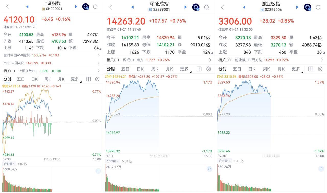午盘印象(1月21日) 科技反弹 指数修复 外围:美股大跌 科技股极弱 影响负面 内股:科技回暖 指数反弹 红利控盘 一、三大股指开绿: 指数弱势开盘 个股开盘涨平跌比率16%:8%:76%。 个股开盘巨弱(-60 Vs +7个百分点), 远输上个交易日,惯性使然, 二、指数低开回升翻红 科技反弹,AI硬件强势,红利又控盘 半日交易1.63万亿,量能大幅萎缩 三、涨跌幅榜: 科技全反弹,红利又控盘 跌幅前列:红利、消费 涨幅前列:金属类、AI硬件、机器人 四、开盘和午盘: 开盘:沪-0.25%、深-0.38%、创-0.24%。 午盘:沪+0.16%、深+0.76%、创+0.85%。 低开拉升高走震荡,沪弱深强又逆转 五、午盘个股上涨54%,已超五成,与昨日涨跌差距(+12 Vs -27个百分点),大幅改善 相比开盘,涨跌差极正面,上涨个股大增; 净流入 +134 (-774)亿,资金少见的回流 六、沪深两市成交量午盘16,310亿,上个交易日18,479亿,同比量能大幅萎缩近2,200亿,缩量微涨。 七、指数惯性低开回升 情绪平复中 融资额连续10天增长后,连续下降80、140亿,降杠杆、降温已见成效,游资极度谨慎 午后两种情形: 1、横盘宽幅:时间换空间,修复情绪,震荡消化获利。 2、震荡回调:高位谨防跳水,情绪未稳定,慢牛格局不变。