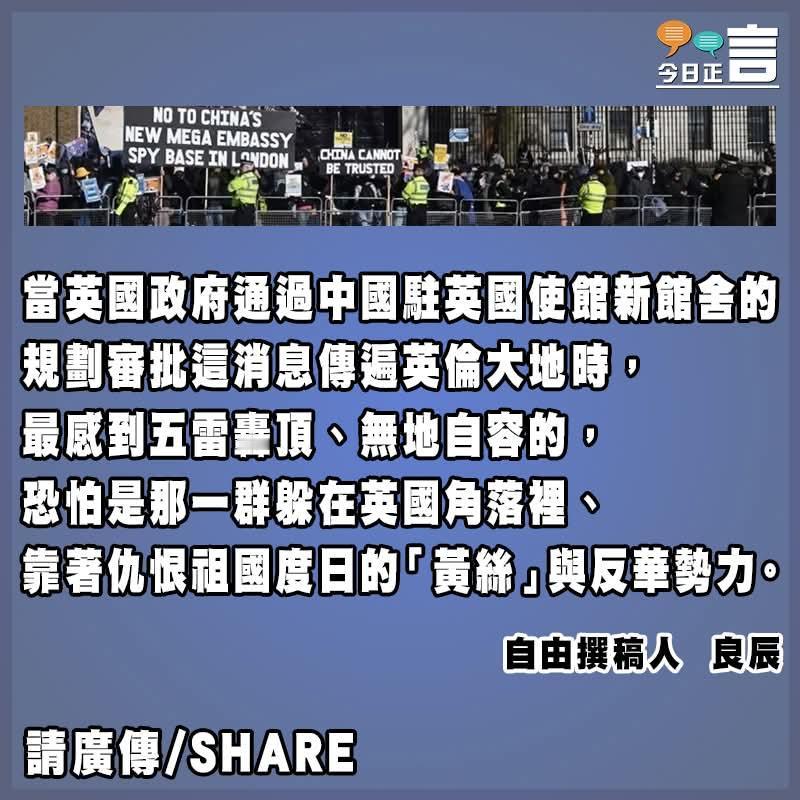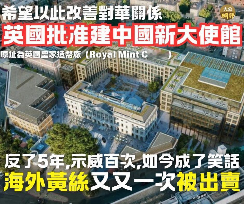 《香港高Sir•高能•热点词》 2025.01.21 热点词:中国驻英超级大使馆终成真 英国急欲对华示好 香港移英黄丝成为弃卒 英国政府发表声明,宣布通过中国驻英国使馆新馆舍的规划审批。此举意味着终于结束了自2018年以来的漫长争论。使馆新址位于伦敦东部,原为英国皇家造币厂。此前,英国方面一直以所谓存在「间谍风险」为藉口拖延批准该大使馆的建设。根据规划申请,这座新大使馆将成为世界上最大的外交机构之一。 高SIR:历史的车轮滚滚向前,从不以小人的意志为转移。英国政府正式宣布通过中国驻英国使馆新馆舍的规划审批,这场历时七年、充满政治算计与流言蜚语的闹剧,终于以正义与现实利益的胜利告终。这标誌着中国驻英「超级大使馆」终成真,不仅是中英关係史上的一个重要里程碑,更是对那些妄图阻挠国家发展、出卖民族利益者的沉重打击!回首过去七年,这地块的审批过程何其艰难,从莫须有的「间谍风险」到荒谬的「电缆安全」,英国政坛部分反华势力配合美国的指挥棒,百般刁难。然而,当世界经贸秩序遭受重创,当特朗普的关税大棒挥向欧洲,英国终于从幻梦中惊醒——谁才是真正的贸易伙伴?谁才是稳定的经济支柱?事实证明,英国急欲对华示好已是不可逆转的战略选择。首相施纪贤振兴经济的承诺需要中国市场,为未来的访华之行扫清障碍已成当务之急。难道英国会为了几句虚假的口号,放弃与世界第二大经济体合作的历史机遇吗?最令人感到讽刺与可悲的,莫过于那些窜逃海外、日夜幻想能「撼动」祖国的跳樑小丑。过去几年,一批移居英国的香港「黄丝」举行了无数次示威、冲击,在中国驻英大使馆外摇旗呐喊,自以为是「民主前哨」,实则不过是反华势力手中最廉价的政治工具。如今审批尘埃落定,这些曾经在街头声嘶力竭的反对者,可曾感受到被主子彻底无视的寒意?当英国政府在声明中强调审批是「最终决定」,当英国安全部门直指「风险被夸大」时,香港移英「黄丝」成为弃卒的命运便已註定。高SIR认为,中国驻英新馆舍的兴建,象徵着中国国力的壮大与外交影响力的提升。在跨入2026年的大潮中,稳定与发展才是人心所向。那些仇视国家、背叛民族的弃卒们,终将在历史的角落里被遗忘,而一个更强大的中国,将在世界舞台中心屹立不倒!