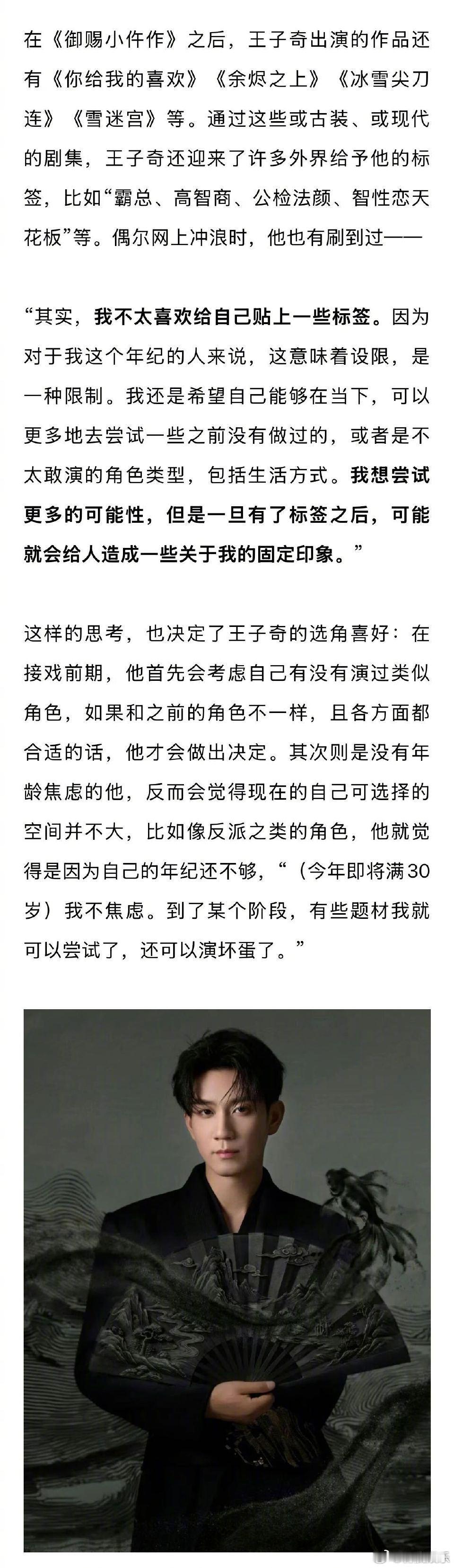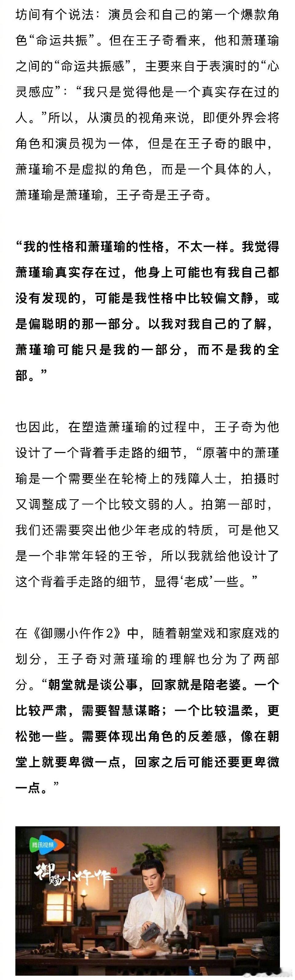 王子奇说自己无法拒绝萧瑾瑜王子奇说年龄不是焦虑而是财富 新浪娱乐工作室独家对话,原班人马回归拍摄《御赐小仵作2》,他坦言有无法拒绝的理由,“这部剧要拍,我就要来演。萧瑾瑜是我的人生角色,我拒绝不了,没有不演的理由。”对于当下的青年演员而言,如果发展较为平顺,就会出现一些“资源咖、待爆咖”之类的讨论。当询问王子奇是否会介意这些称号时,他笑着反问:“你觉得我是什么咖呢?我什么咖都不是,我只是在一部一部地诠释我想要演绎的角色和作品,这就可以了。”谈及外界建议,王子奇直言:“其实很多事情不一定是演员需要做的。我会听取一部分建议,然后再去探讨。我觉得我还是应该做自己,做好演员的本职工作,能拒绝的话就要坚定地去拒绝”。比如以出发图举例,在他的理解中,有些时候就是可以拒绝的。在王子奇看来,所谓的年龄增长不是让人产生焦虑的源头,更像是一种财富,“经验会多一点,人会更平静一些。保养得当的话,我还有一副二十多岁的脸庞,既能演三十多岁的角色,还能演二十多岁的人物。”更多内容戳↓王子奇