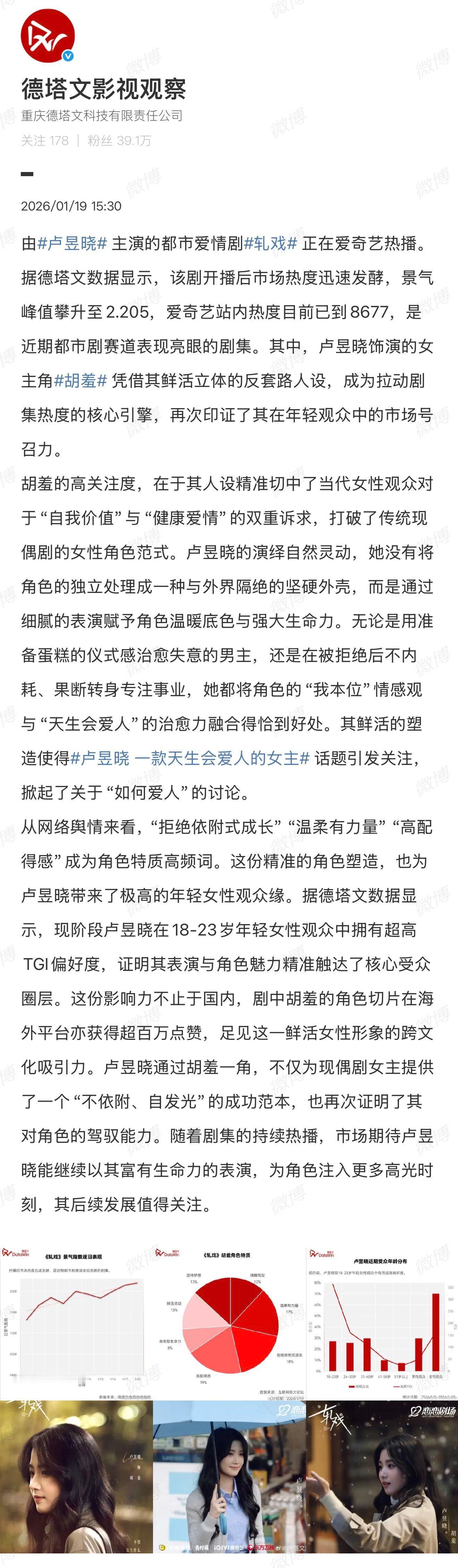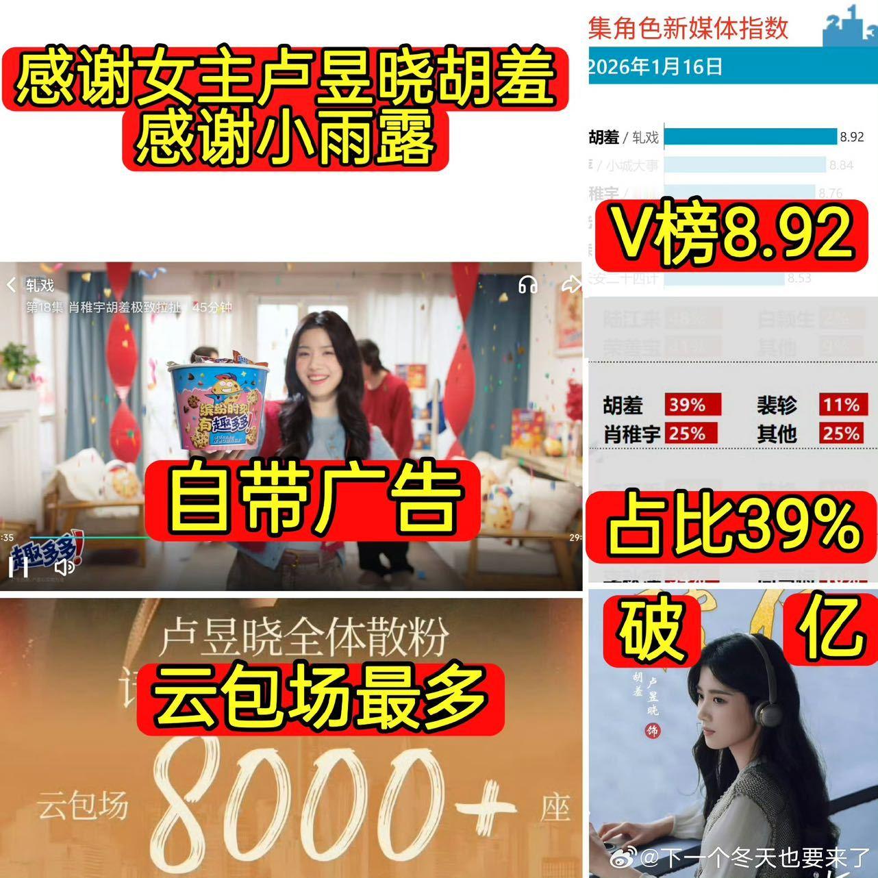 卢昱晓工作室文案有点怜爱了,轧戏这部剧卢昱晓承受了太多,剧宣、云包场都不拉垮,连广子都靠女主商务,女主粉既不争番也不抢实绩专心护剧