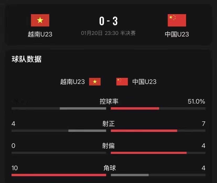 U23男足亚洲杯半决赛,中国U23男足 3:0战胜越南U23男足,昂首挺进决赛,将与日本U23男足争夺冠军。中国U23男足一改小组赛和四分之一决赛时防守反击的战术,以控球战术主导半决赛,打脸了诸如董方某、赵某等一众中国男足“名宿”。中国U23男足主教练安东尼奥确实有些东西,防得住,控的稳。这是中国男足自2004年进入亚洲杯决赛以来最为高光的时刻。今天是中国男足球迷幸福的日子。中国U23男足以0失球进入决赛,创造了历史。决赛加油,小伙子们!中国足球需要这样的时刻