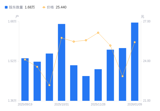 日期A股户数(户)流通A股户均持股数(股)户均持股市值(万元)2026-01-09167609037.6522.992025-12-19157289630.6622.022025-12-10156669668.7724.352025-11-281487710181.5626.632025-11-201460010374.7326.542025-11-101503610073.8925.672025-10-31167039068.4923.362025-10-20155089767.2821.672025-09-30151789979.6423.532025-09-19153189888.4323.86