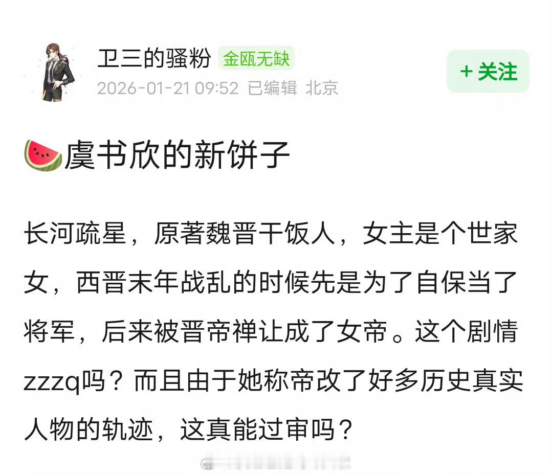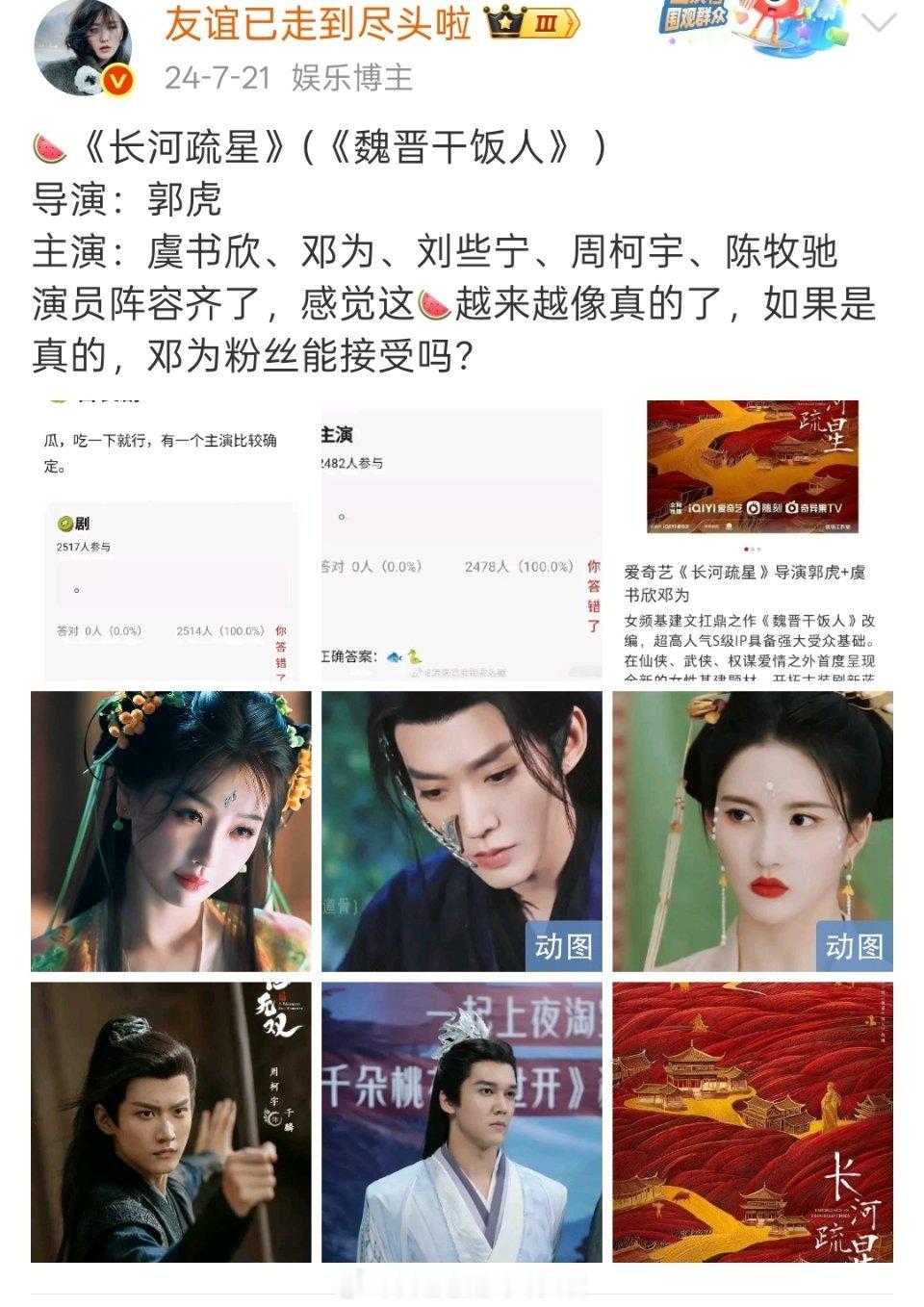 《长河星疏》这个饼从2024年7月就开始传虞书欣,邓为,还挺坚持不懈的原著《魏晋干饭人》是基建文,讲男女主一起穿越到晋朝末期征战乱世,女主建功立业成为一代王朝开国女帝的故事,全文有点流水账,不知道适不适合改编电视剧男女主更像战友不像情侣,男主也没有什么权谋线事业线,全文就像女主身边的叮当猫,负责搞发明创造给女主用来赚钱发展经济的,对男演员来说真的不是啥好饼