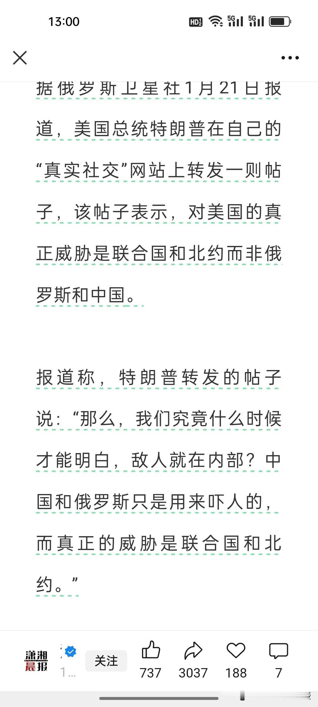 特朗普一直都是打明牌。特朗普刚刚又发文称,对美国有威胁的不是中国和俄罗斯,而是联