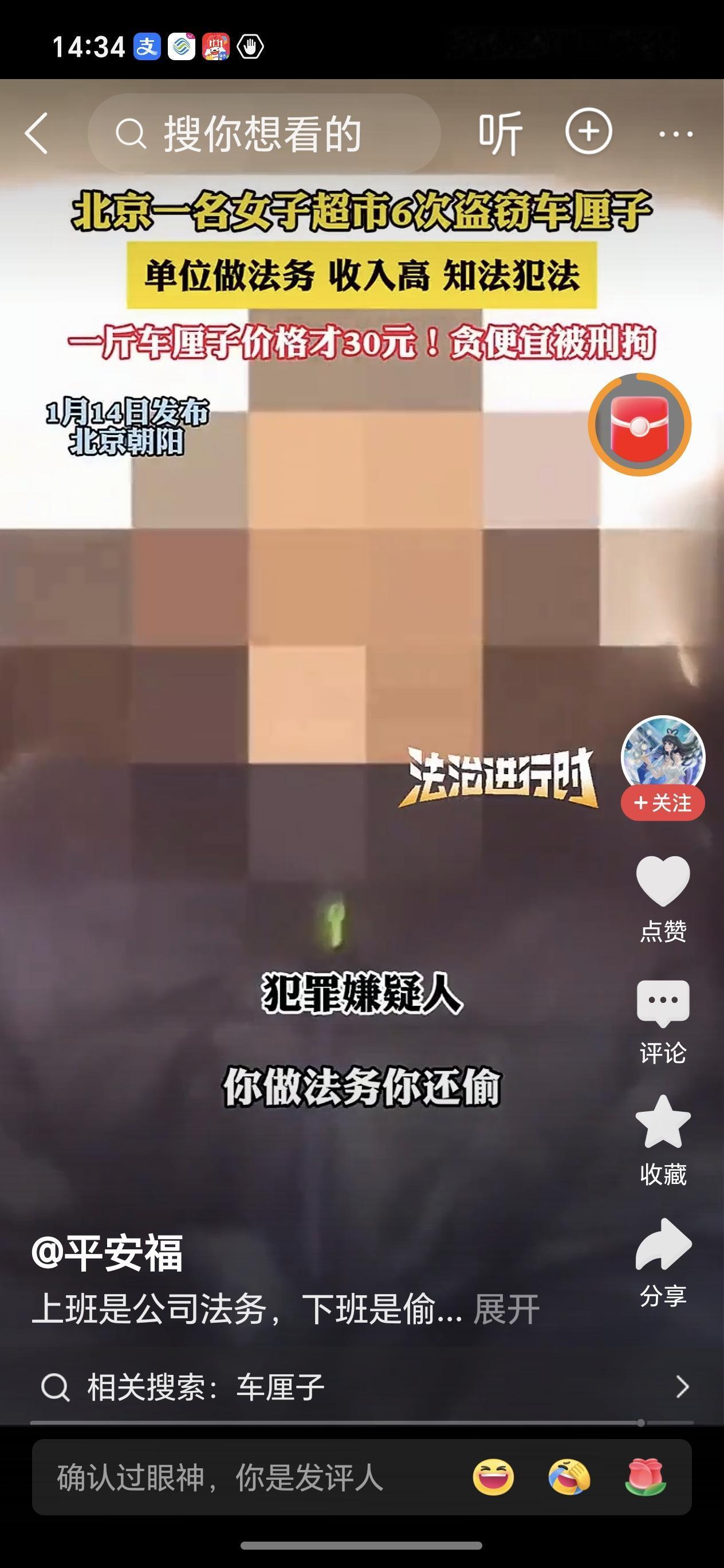 上班是法务下班是偷车厘子惯犯 北京这法务女子的操作真是让人惊掉下巴!据报道,该女子身为公司法务收入不低,可还是贪小便宜在超市6次偷车厘子,另外草莓、瓜子也没放过,监控里她把东西藏包里,扔包装盒来隐藏痕迹。 事情是超市老板发现角落有空盒,一查才锁定她。民警找上门时,她还试图抵赖,后来才招供。原来她是发现超市结账漏洞,就起了贪念。 一斤车厘子才30元,为这点便宜把自己弄进局子,还是法律工作者,知法犯法,实在让人难以理解。这下好了,工作和名声估计都没了,真是得不偿失!
