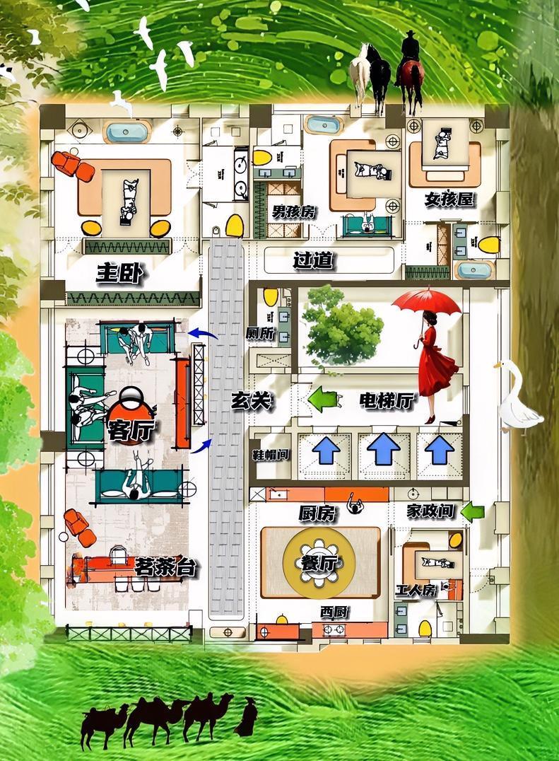 长横厅,没留一条伤痕,母子宅,不打架,实诚成为它的荣耀,家政间,不扰梦,绝对最暖心的夏里巴人,435㎡在我看来最配享大平层的神户型! 改房子半辈子,没看到,布局如此简练的房子,就是一个动线不拖泥带水,格局真实存在的大宅! 横厅就一个字,阔,喜欢它的满屋阳光,最不折扣的三联客厅!围合式沙布讲道理,茗茶香娓娓道来! 小小的洄游动线,营造出,一玄关,主打收纳。二端景,挂电视。三屏风,管出线! 二十八米过道,布局上清澈,真是大平层的必需品,打通三个空间的关键! 相当于,横厅是面子,母子宅是里子,餐厨家政是烟火人间,同在一个屋檐下的再融合! 布局能仰望星空,动线让人深迷高台, 用一砖一瓦的搭建,有规律的方正户型,虽说三梯长厅有点奢侈,绝对是最实在的布局! 用不花丽的动线,平凡最终站上属于自己的巅峰! 惹,98%的人的眼光!
