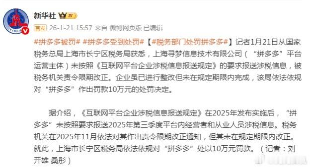 拼多多受到处罚拼多多未按规定报送涉税信息,罚款10万元。详细的说,2025年发布实施后,“拼多多”未按照要求报送2025年第三季度平台内经营者和从业人员涉税信息。还以为是拼多多砍一刀被整治了拼多多受到处罚