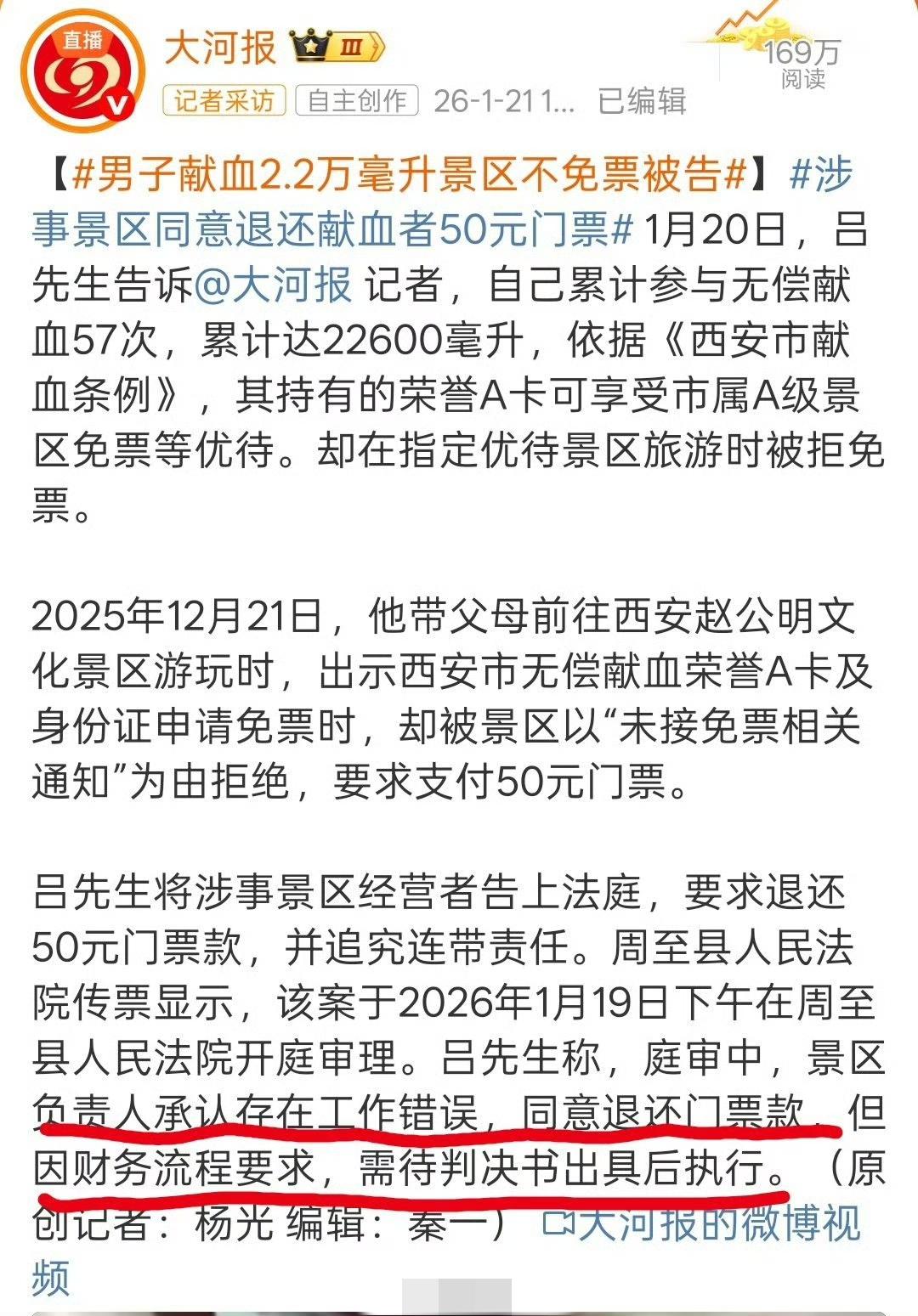 男子献血2.2万毫升景区不免票被告。 “庭审中景区承认错误,同意退门票款,但因财务流程,还需判决书出具后执行” 第一次见自己错,还要等判决书才退款的![摊手] 明摆着就是故意恶心人…… 献血三免政策 献血乱象 无偿献血新规