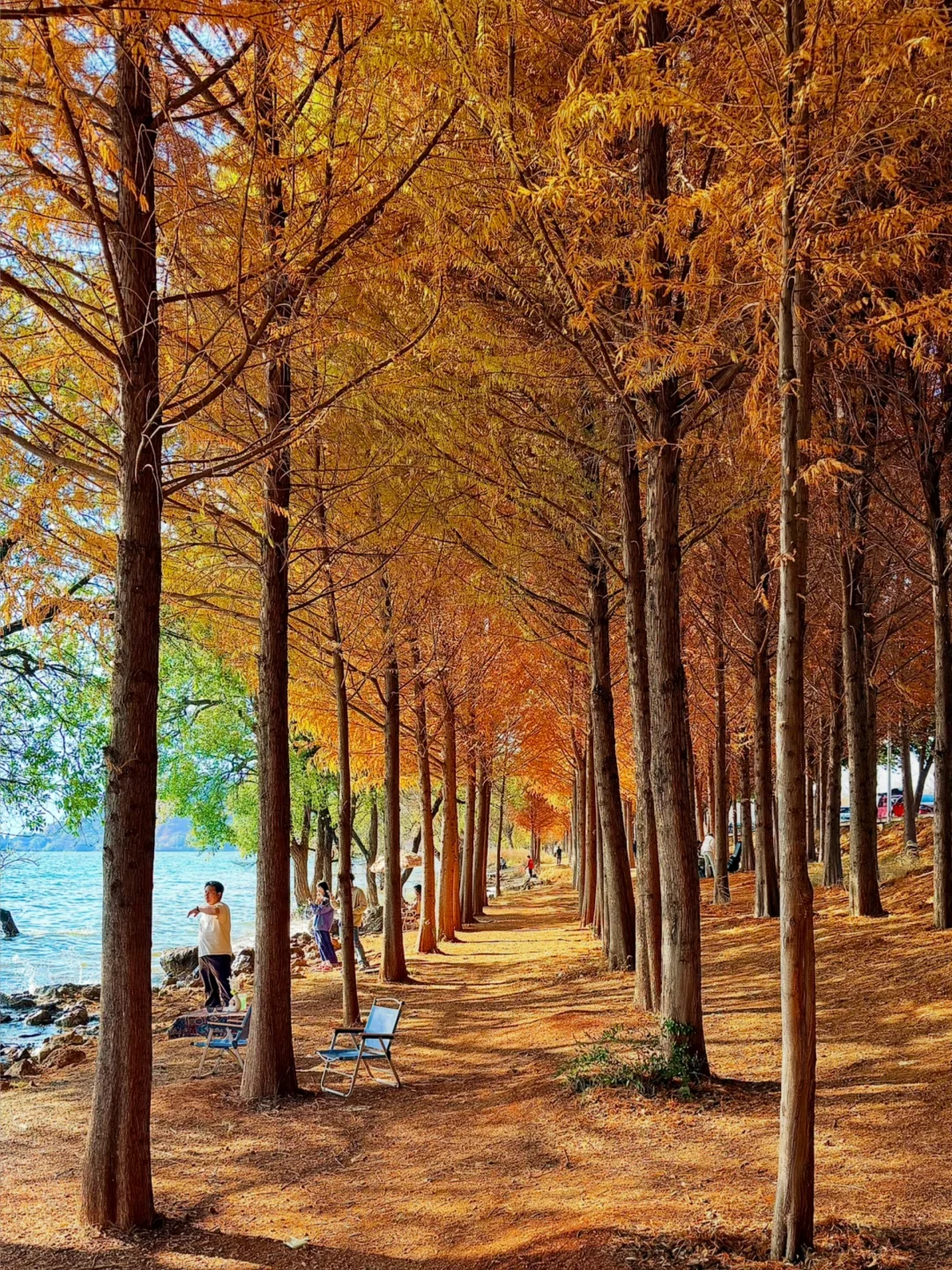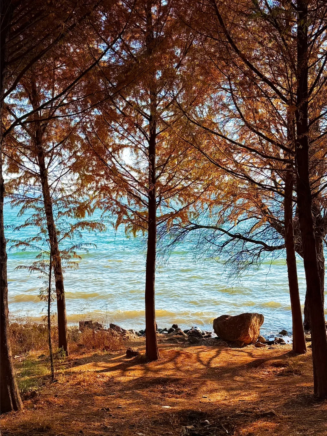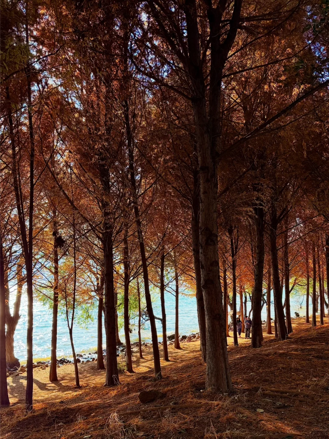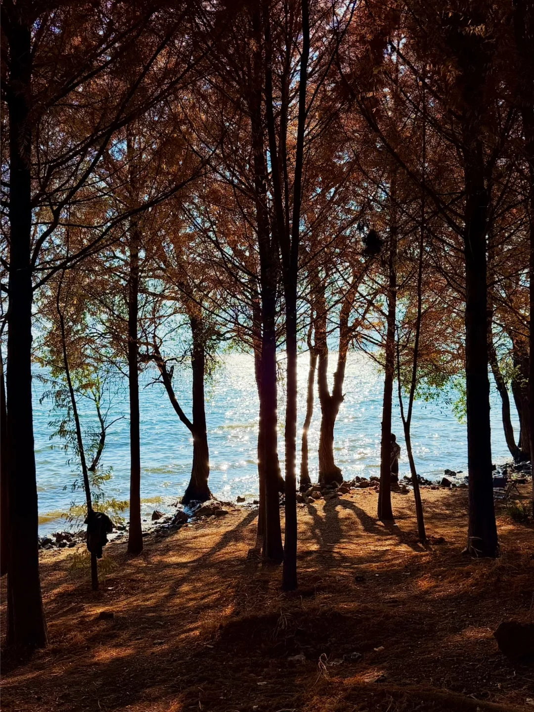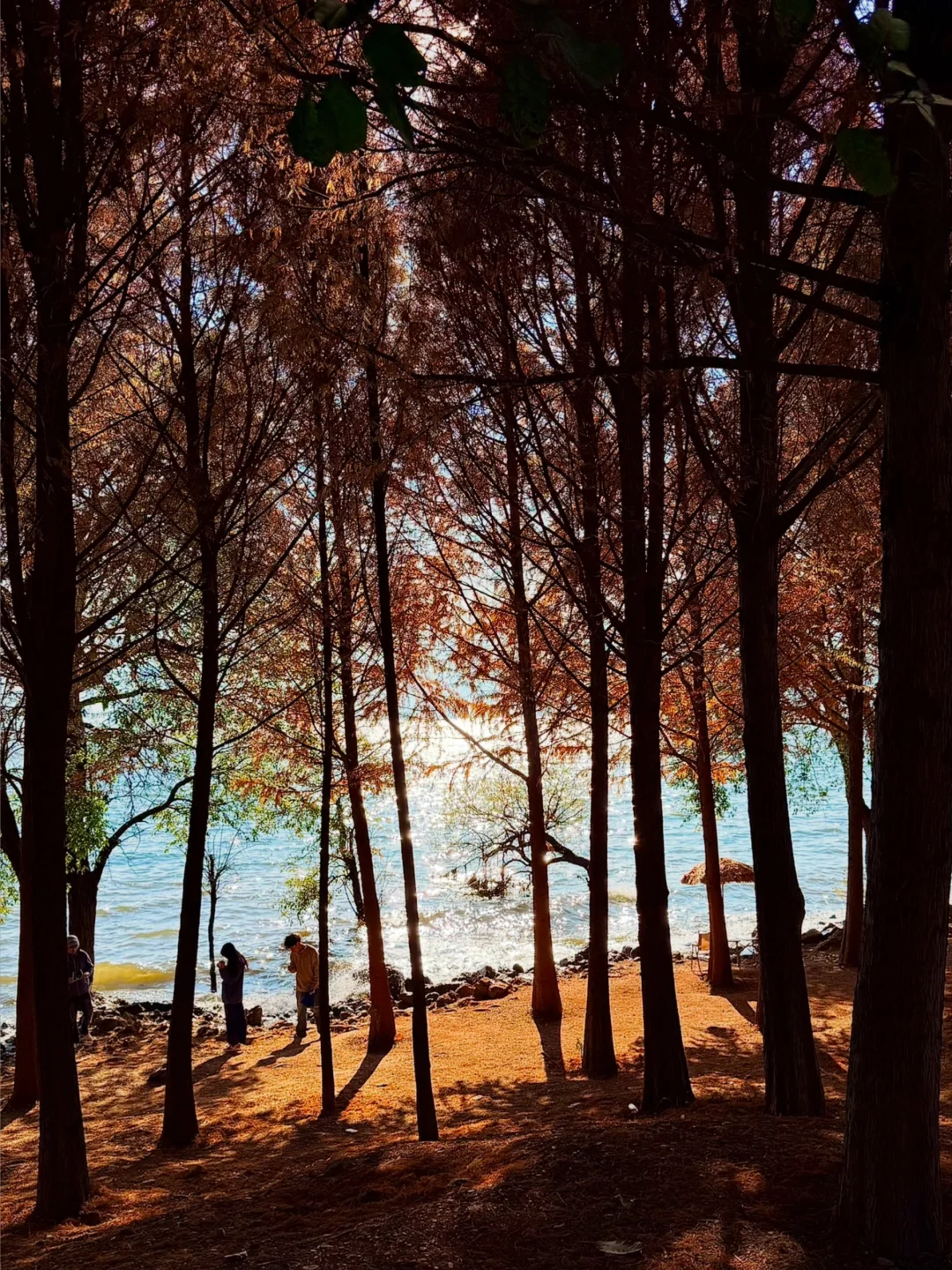 从喜洲驾车前往双廊的路上发现的!! 有水杉➕落日余晖,洒在海面上好漂亮!!!! 忍不住下车拍照📷 发现的人也少,可以狠狠出片 刷到的朋友一定要早点去! 衬着水杉的叶子还没掉完~ 拍摄的时间差不多是下午四点那样子 📍双廊古镇景区观景台附近