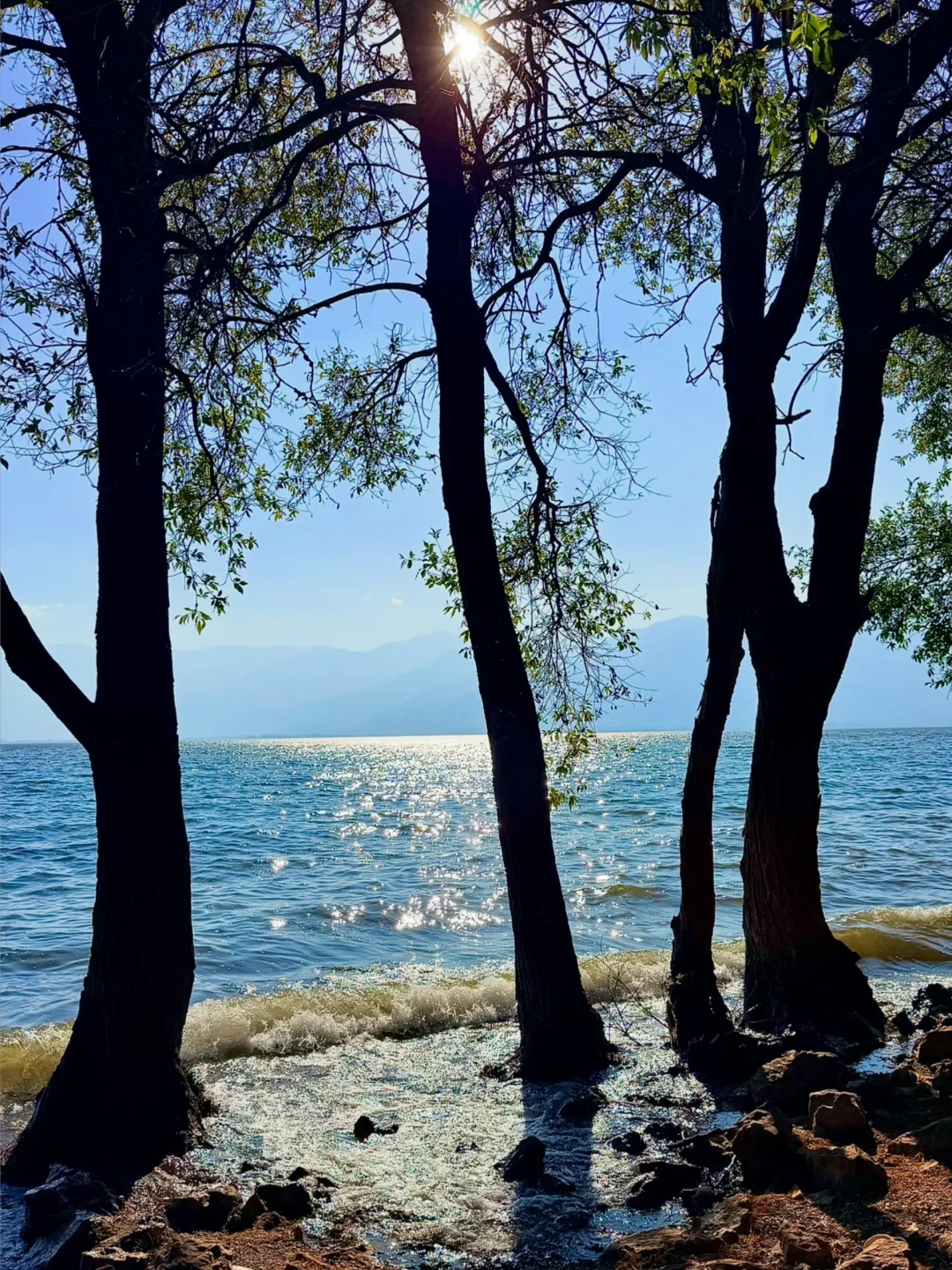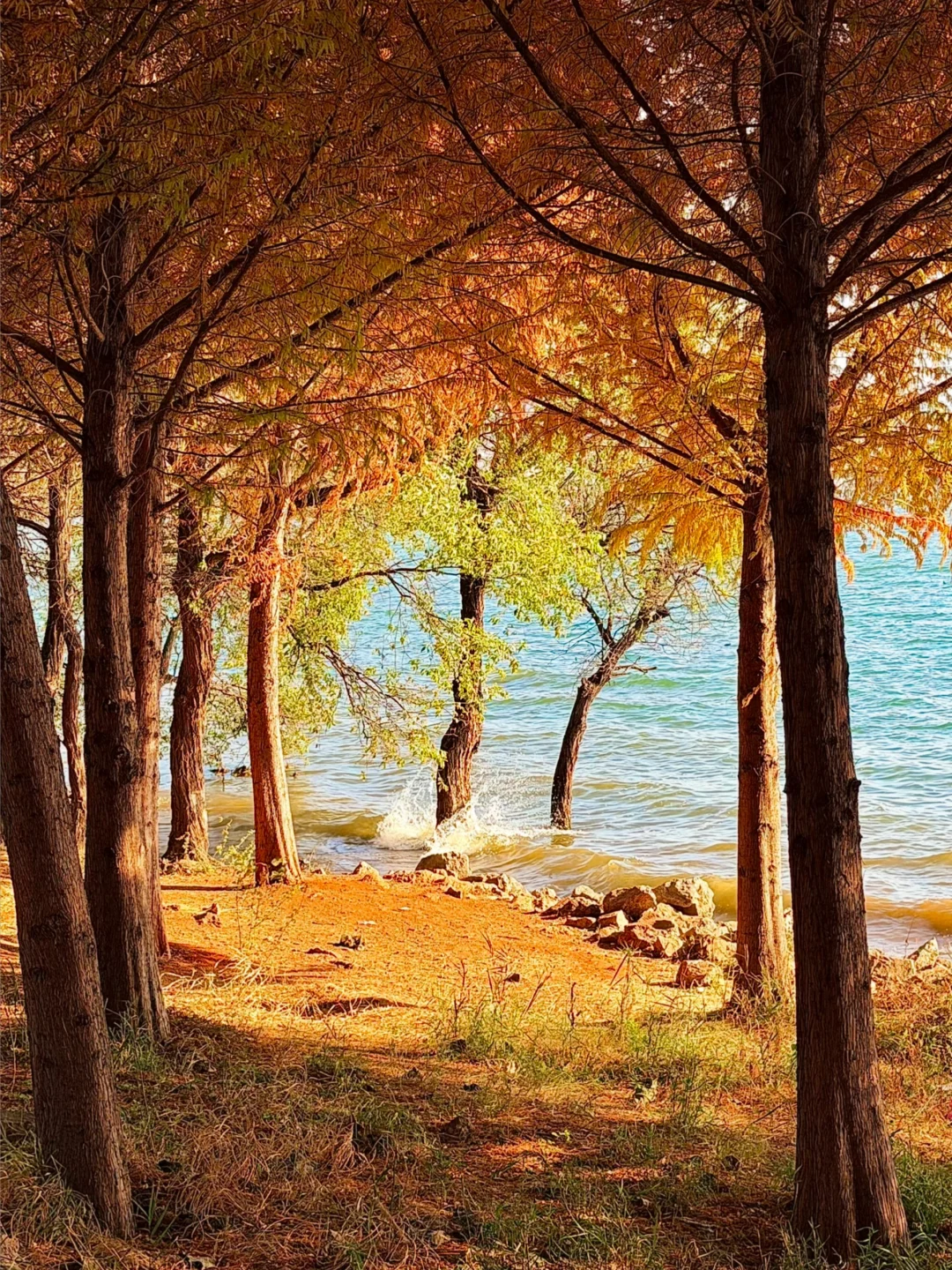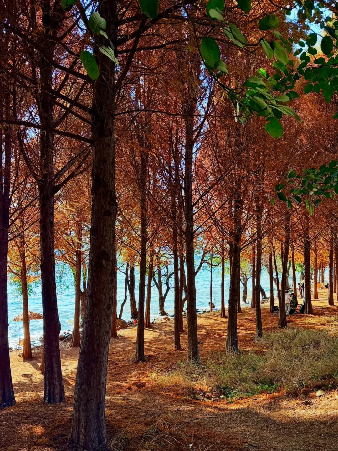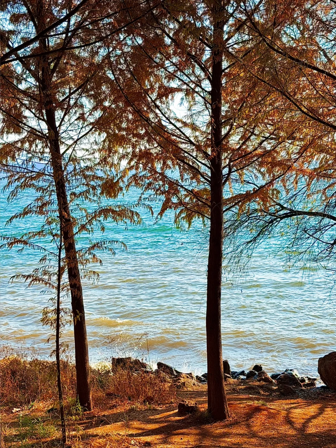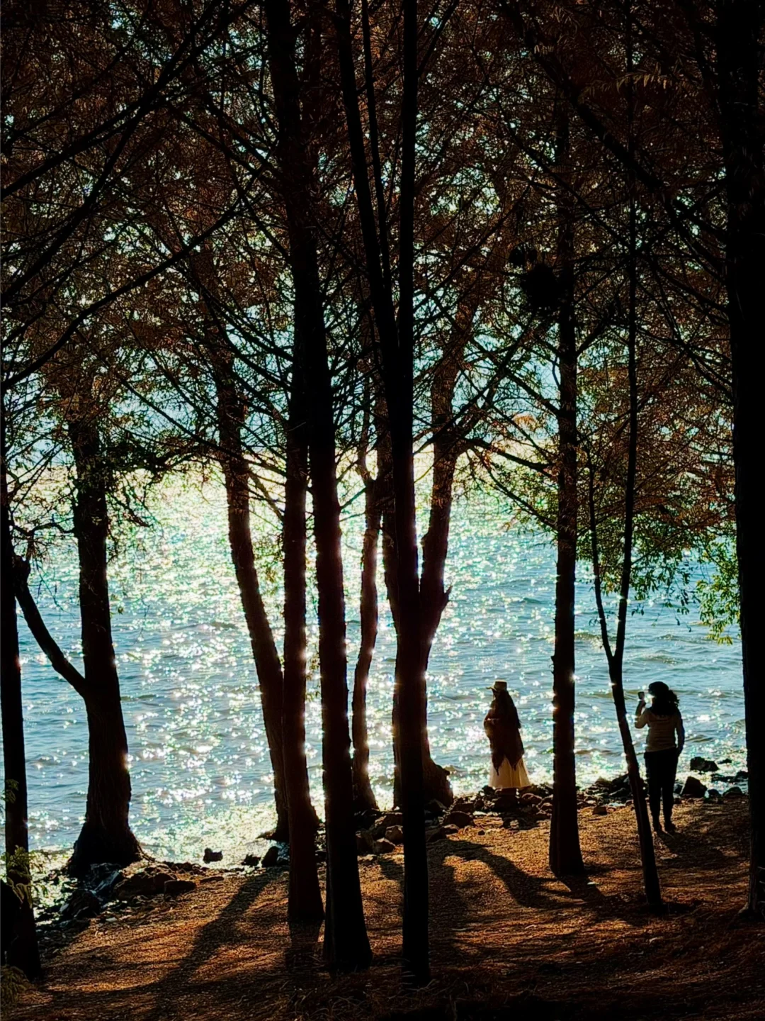 从喜洲驾车前往双廊的路上发现的!! 有水杉➕落日余晖,洒在海面上好漂亮!!!! 忍不住下车拍照📷 发现的人也少,可以狠狠出片 刷到的朋友一定要早点去! 衬着水杉的叶子还没掉完~ 拍摄的时间差不多是下午四点那样子 📍双廊古镇景区观景台附近
