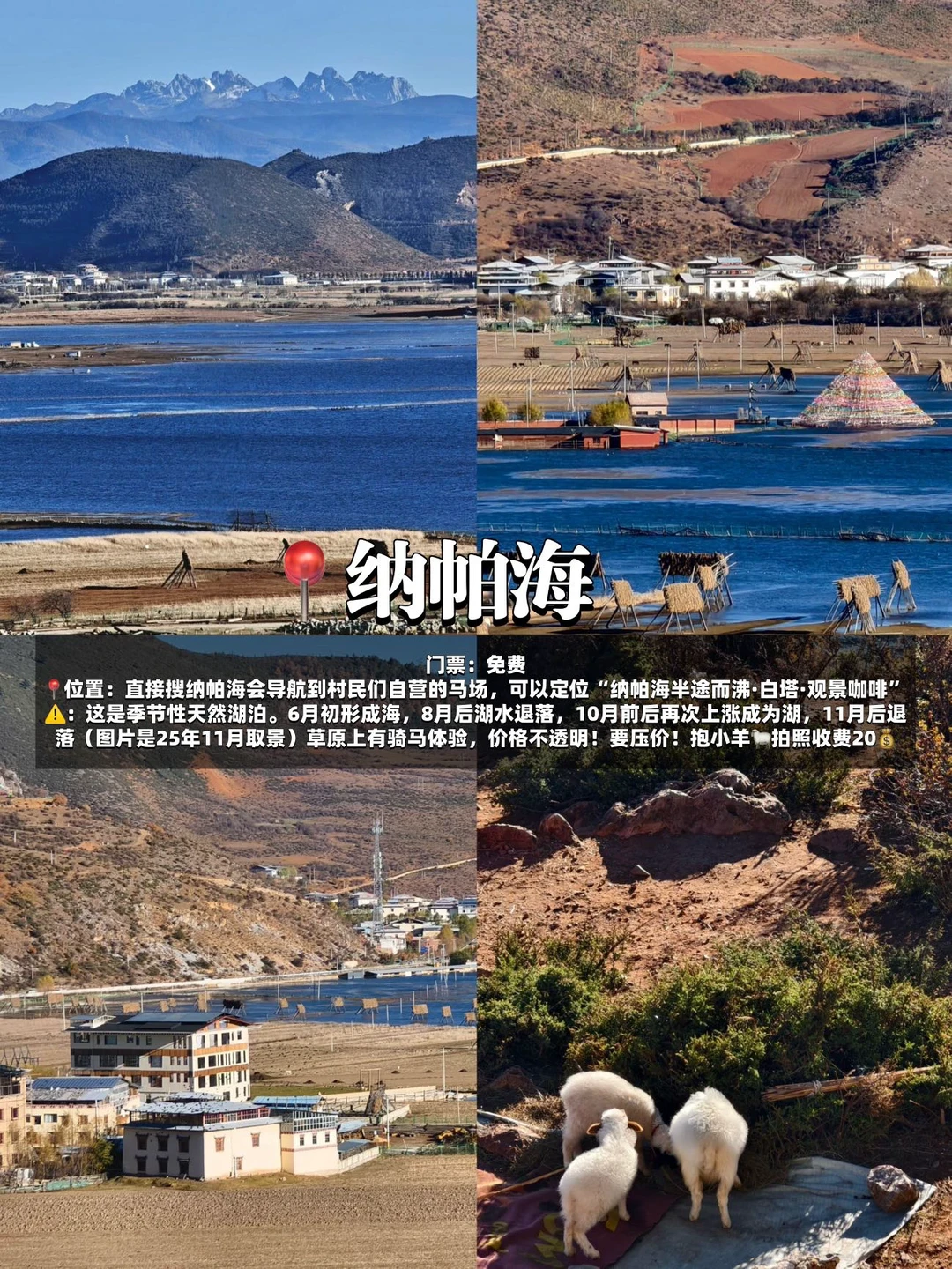 ‼️是季节性天然湖泊,6月初成海、8月退落、10月复涨、11月后回落。草原骑马体验要压价,抱小羊拍照收费20💰(每个季节各有美景)