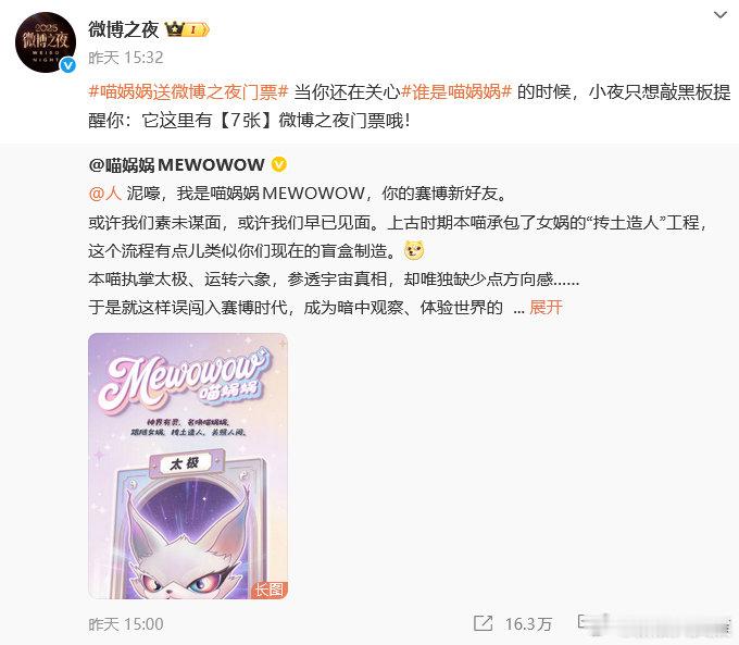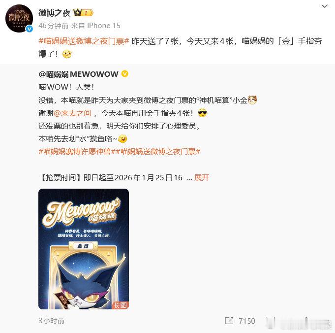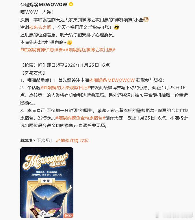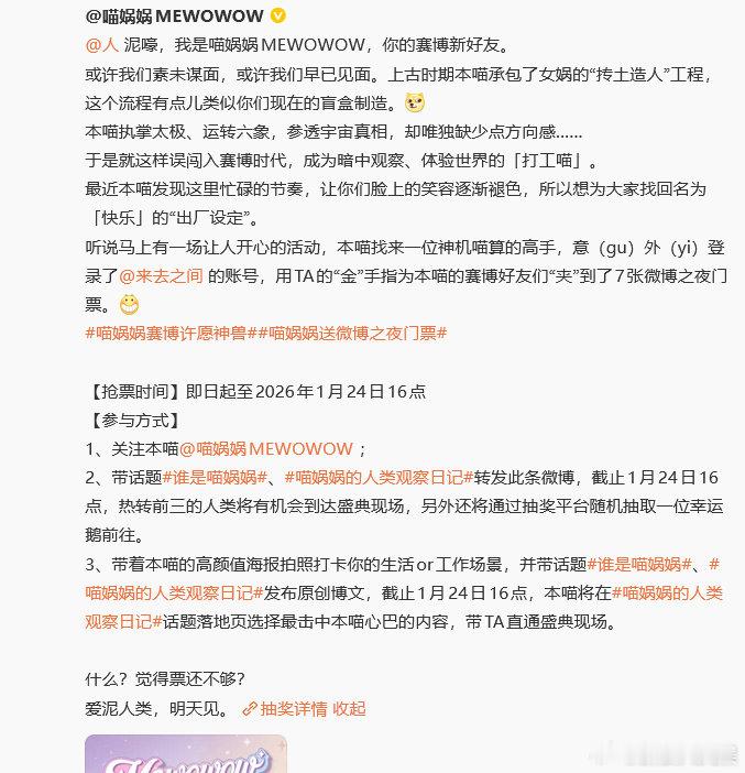 喵娲娲 夹微博之夜门票喵娲娲 谢谢来总再送4张门票 业务王者+摸鱼大师+福利发放员= ,谢谢你让我见识到“又能干又好玩”的完整版打工人模板。