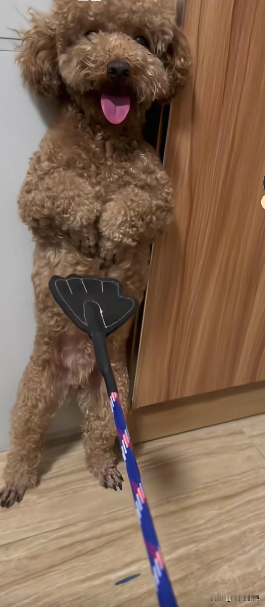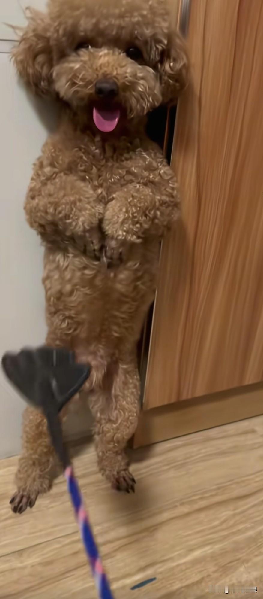 泰迪公狗随地乱拉乱尿尿,主人十分脑火,正握着扫把准备教训它。胆小的它起身子站立在