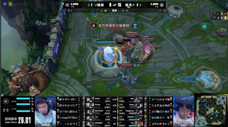 后期小龙团sasi贾克斯1v3爆斩Tangyuan吉格斯,LGD轻松2换5,一波推平LNG基地扳回一城。