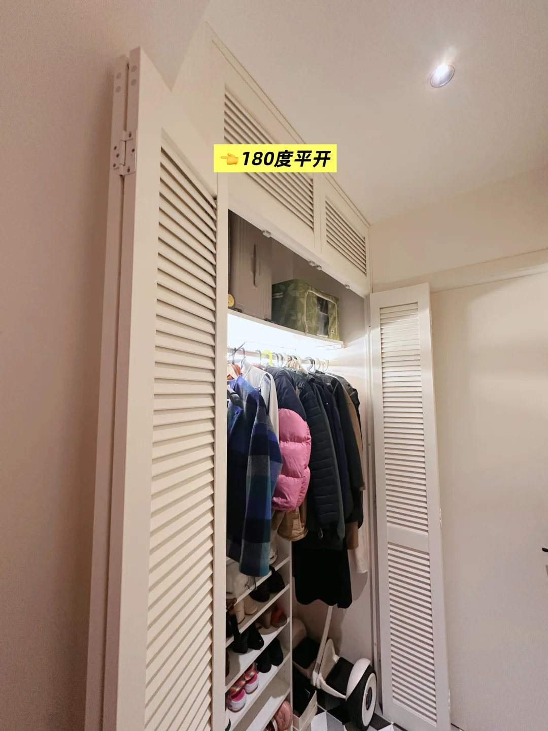 一点儿不夸张。 事情是这样的。老客户书房轻改造,约了我上门先看看。来都来了,咱必须顺便做个回访,看看空间用得怎么样。 这一推开玄关储物间,我都羡慕了。这大冬天,谁家有了这么长的挂衣区,不就让羽绒服、大衣从椅背、沙发、飘窗上消失了嘛! 这还是2021年的设计案例,可以非常骄傲自夸,咱的设计能力还是很经得起时间考验的,低成本实现了空间最佳利用。 今天我才留意到一个我都遗忘的细节,当年我们做这个玄关储物间的时候,把折叠门用了180度平开,这样玄关通道就一点儿也不会拥堵。