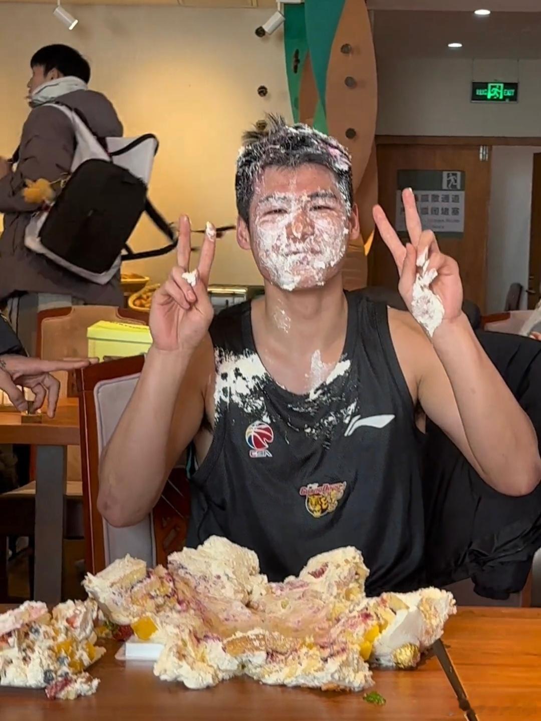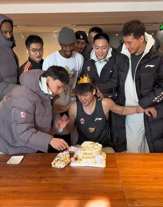 生日快乐!广东宏远全队为陈家政庆祝20岁生日,氛围真不错啊,期待今晚用一场胜利给