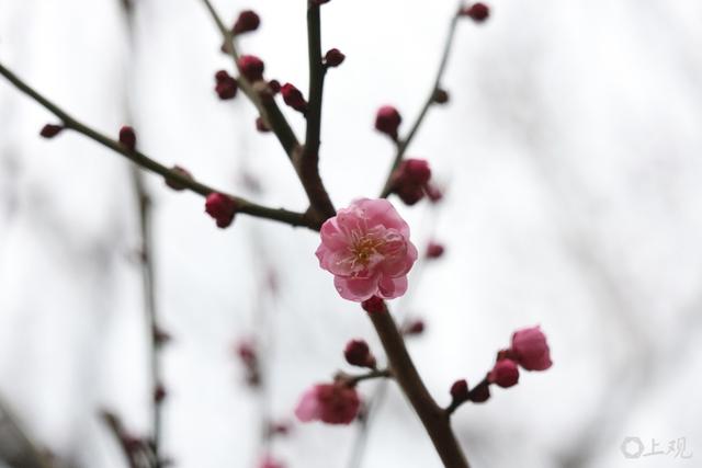 莘庄梅园广泛栽培的早花品种粉红朱砂也已相继开放,色泽艳丽,营造出更浓郁的春意。