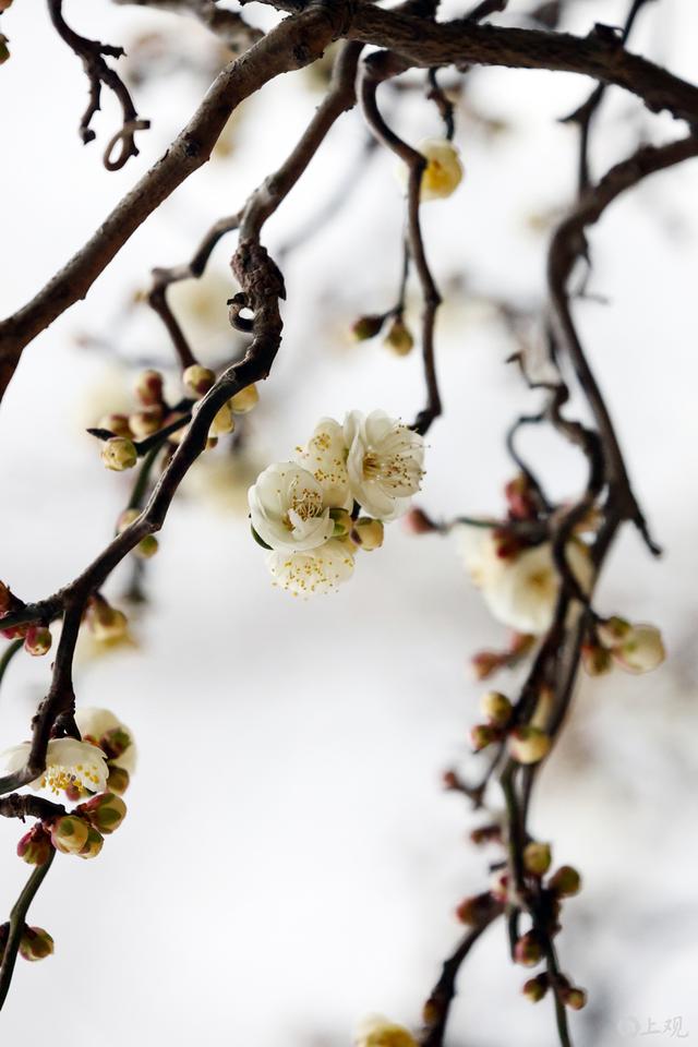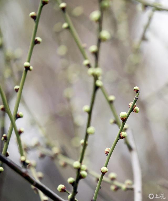珍稀品种绿萼梅也不顾寒意含苞待放。绿萼梅属于梅花品种分类系统中的真梅系直枝梅类绿萼型,自古就深得人们喜爱,盛开后更显清雅幽深。