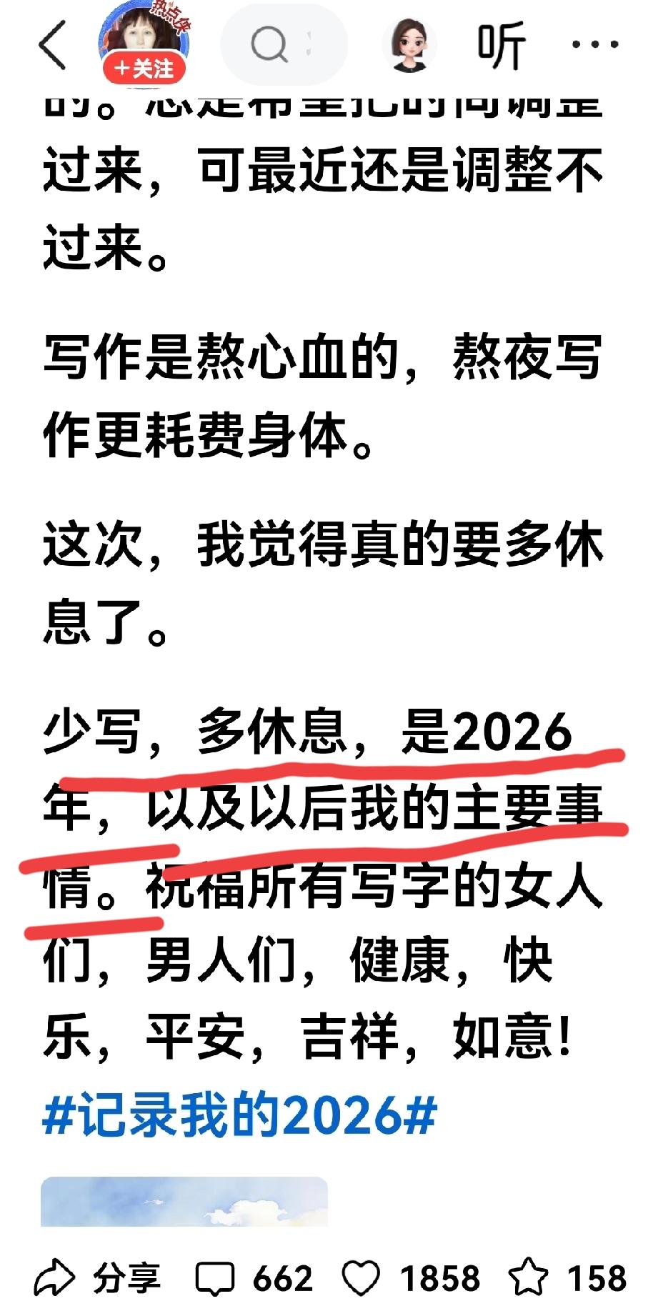 突然去世的女创作者最后一句话令人感动、思绪万千! 这位女创作者的突然去世惊动了素老三,她的离开就像一块巨石砸向湖里,在素老三的心底里掀起层层巨浪,让素老三久久不能平静!为此素老三还专门写了一篇微文,说了她的感想,而就是这样的一件事可能会改变素老三今后的创作生活! 素老三在微文中写道,她在网络上结识了这个人,但在实际生活中并不认识她,素老三说这是一位视创作如命的女人,擅长写长文,文章写得非常好,但没有特别红起来。 素老三查了一下这位女创作者的最后一篇文章,她的最后一句话是:“今天不更新了,向大家请个假,心里堵得慌,想去医院看看!” 去了医院后,这位女创作者再也没能回来,她就这样永久的离开了,她的儿女在她的账号上留言,她们的妈妈去世了,是心梗! 素老三在微文中写道,这位女创作者与她的年龄几乎相当,都是50多岁的女人,不知不觉的就这样走掉了,素老三说她非常勤奋,是一个用生命去创作的人,素老三感慨!这太年轻了,她上有老,下有小,说走就走,突然就不见了,在这个世界上消失得无影无踪,只留下许许多多的优秀作品! 素老三这是写的她吗?素老三这是写的自己啊!素老三日更一万字,每天都忙到12点,而她当天写这篇微文的时候,素老三说她凌晨1点才完成任务,这是她对自己职业的一份坚守,素老三曾说她要用写作再活一回,而这位突然去世的女创作者也是一样,她真的是从写作的岗位上离开的!她的最后的留言、就是对创作刻在骨子里的热爱以及对追捧她的粉丝们的不舍!累了,病了,还要请个假! 素老三也是这样的一位创作者,素老三深深的感触到了,人的身体非常重要,身体健康应该要放在第一位!为什么要那么拼命去创作呢? 素老三最后说,2026年的一年里,她要多休息!少创作!毕竟生命才是最重要的! 友友们!你们的创作累不累?有没有休息好?收益多少无所谓,把身体健康放在第一位才是最重要的,最后祝友友们身康体健!天天开心!越活越年轻!