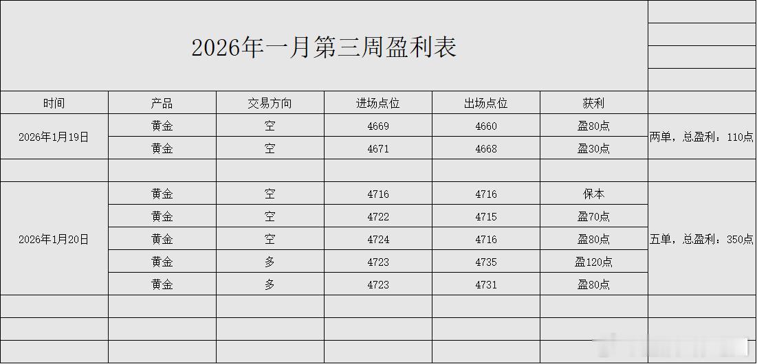 【本周一/周二战绩回顾:日内六盈一保,净利共收割460点】周一操作:第一单:黄金布局4669一线空单,抵达4660位置附近止盈80点;第二单:黄金布局4671一线空单,抵达4668位置附近止盈30点;网页链接 网页链接 网页链接 网页链接 周二操作:第一单:黄金布局4716一线空单,抵达4716位置附近保本离场;第二单:黄金布局4722一线空单,抵达4715位置附近止盈70点;第三单:黄金布局4724一线空单,抵达4716位置附近止盈80点;网页链接 网页链接 网页链接 网页链接 网页链接 网页链接 第四单:黄金布局4723一线多单,抵达4735位置附近止盈120点;第五单:黄金布局4723一线多单,抵达4731位置附近止盈80点;网页链接 网页链接 网页链接 【本周一/周二具体操作过程,且点击上方微博链接查看即可】稳健操作永远是老韩本人不变的风格,行情当中只要时机到位那么就做,收获来那么就抓,就是这么简单!每一单大家皆可自行去对照时间点位!市场博弈不看一朝一夕,我们拼的是持久和稳定,交易没有一时的胜负,只有长期内你的资金能否稳步累积!在投资的时候你看到的是百倍杠杆的利润,而我看到的却是万丈深渊的风险!因为只有把握住风险,收获才会自然而然的落到各位手中!所以各位加入到盘中的朋友,你们只需保持好心态,跟着老韩的脚步一起共同努力,一路续盈即可!!黄金金价