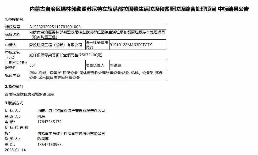 内蒙古自治区政府采购网消息,近日锡林郭勒盟苏尼特左旗生活垃圾焚烧项目公布开标结果,内蒙古蒙投环境股份有限公司的全资子公司蒙投建设(成都)工程有限公司中标其中第三包设备购置工程,中标价2507.51万元。