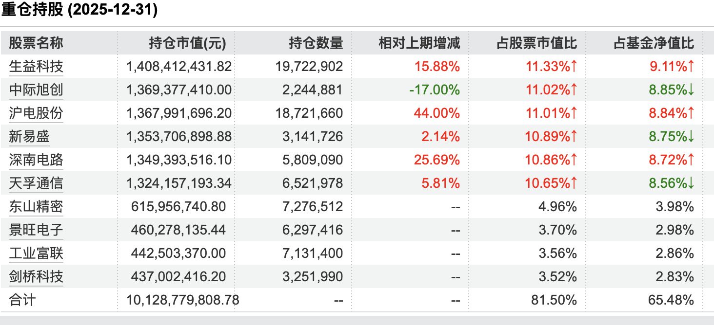 虽然永赢科技智选的重点投向依旧为云计算相关产业,但其在个股层面的调整较大。2025年四季度,在新进重仓东山精密的同时,该基金同步重仓了景旺电子、工业富联、剑桥科技。