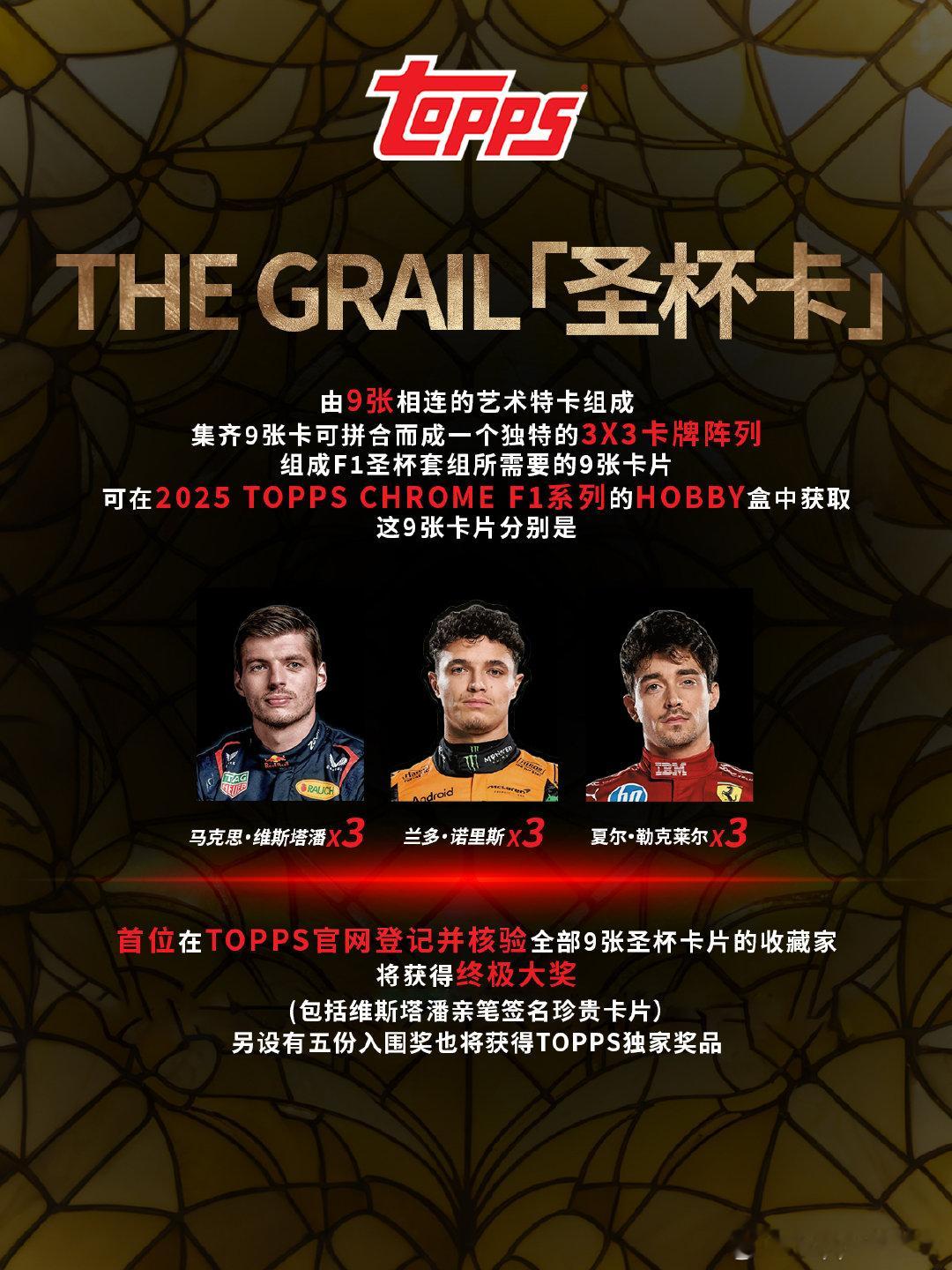 🏆「圣杯收藏」驶入F1赛道!从神话传说,走到收藏殿堂圣杯一直都象征着至高无上的追寻Topps的「圣杯特卡」由九张艺术特卡组成集齐9张卡即可拼成独特的3x3卡牌阵列这一次Topps将「圣杯特卡」从足球领域引入F1世界维斯塔潘、诺里斯、勒克莱尔三位顶级车手亮相📢F1圣杯藏家追逐战即将开启!🔥首位在官网上登记并核验全套圣杯特卡的藏家,将加冕终极奖励!🏁荣耀大奖,举世唯一!更有维斯塔潘亲笔签名珍贵卡片!🎁还有五位幸运藏家也将入围荣耀殿堂,赢取专属奖励!致敬热爱的终极追寻,谁将捧起圣杯?Topps Chrome F1系列即将上线一起开启F1藏家的终极收藏体验Topps F1 ToppsChromeF1系列 维斯塔潘 诺里斯 勒克莱尔