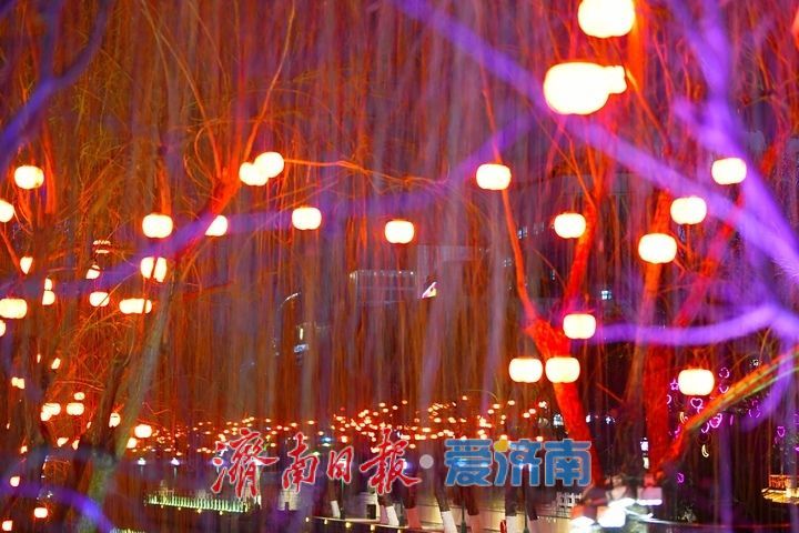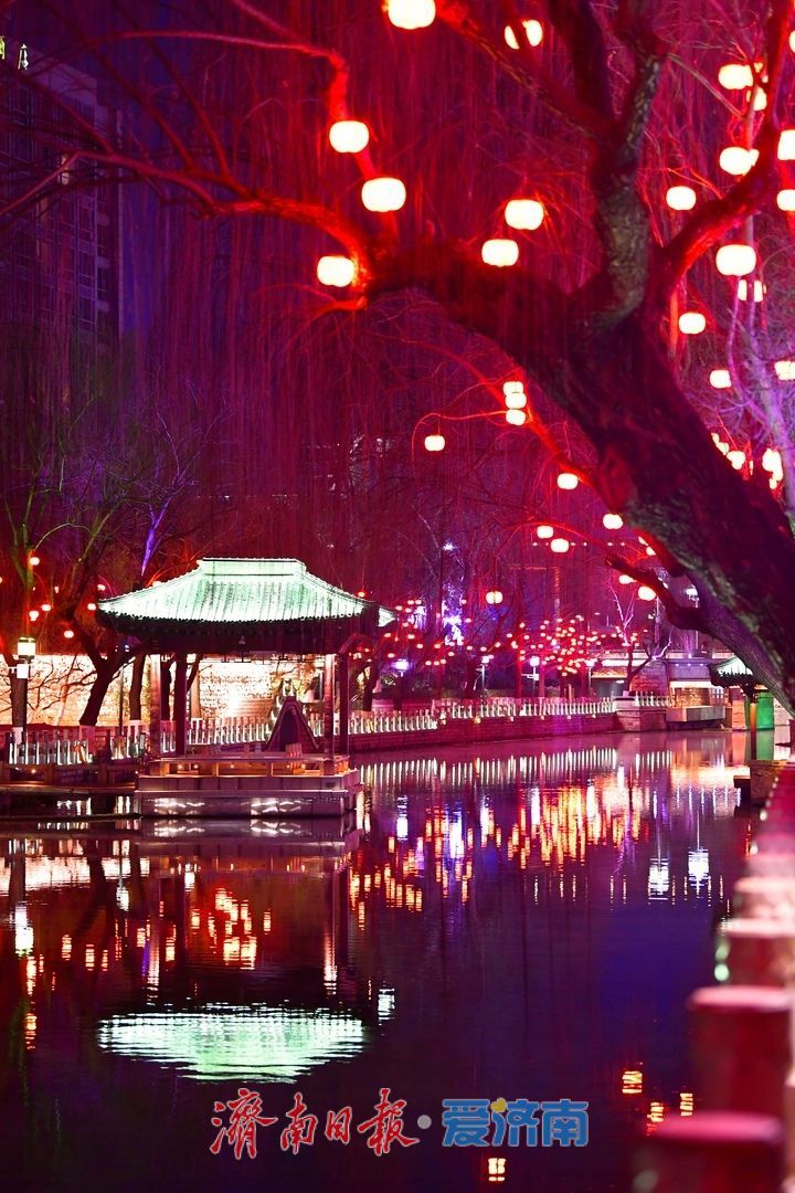 1月21日晚,济南护城河畔灯火璀璨,夜景迷人。沿河悬挂的上千盏橘红色灯笼在夜色中熠熠生辉,融融暖光映照水面,浓浓年味扑面而来。