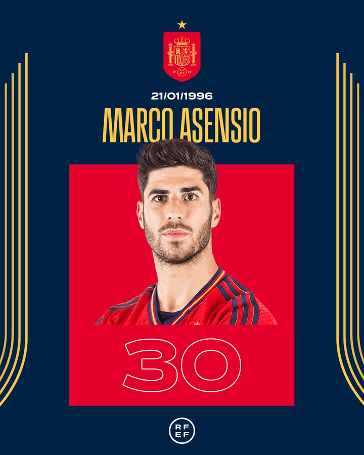 目前效力于费内巴切的阿森西奥,共为西班牙队共出战了37场比赛,贡献2个进球、14次助攻,随队获得了2023年欧国联冠军。