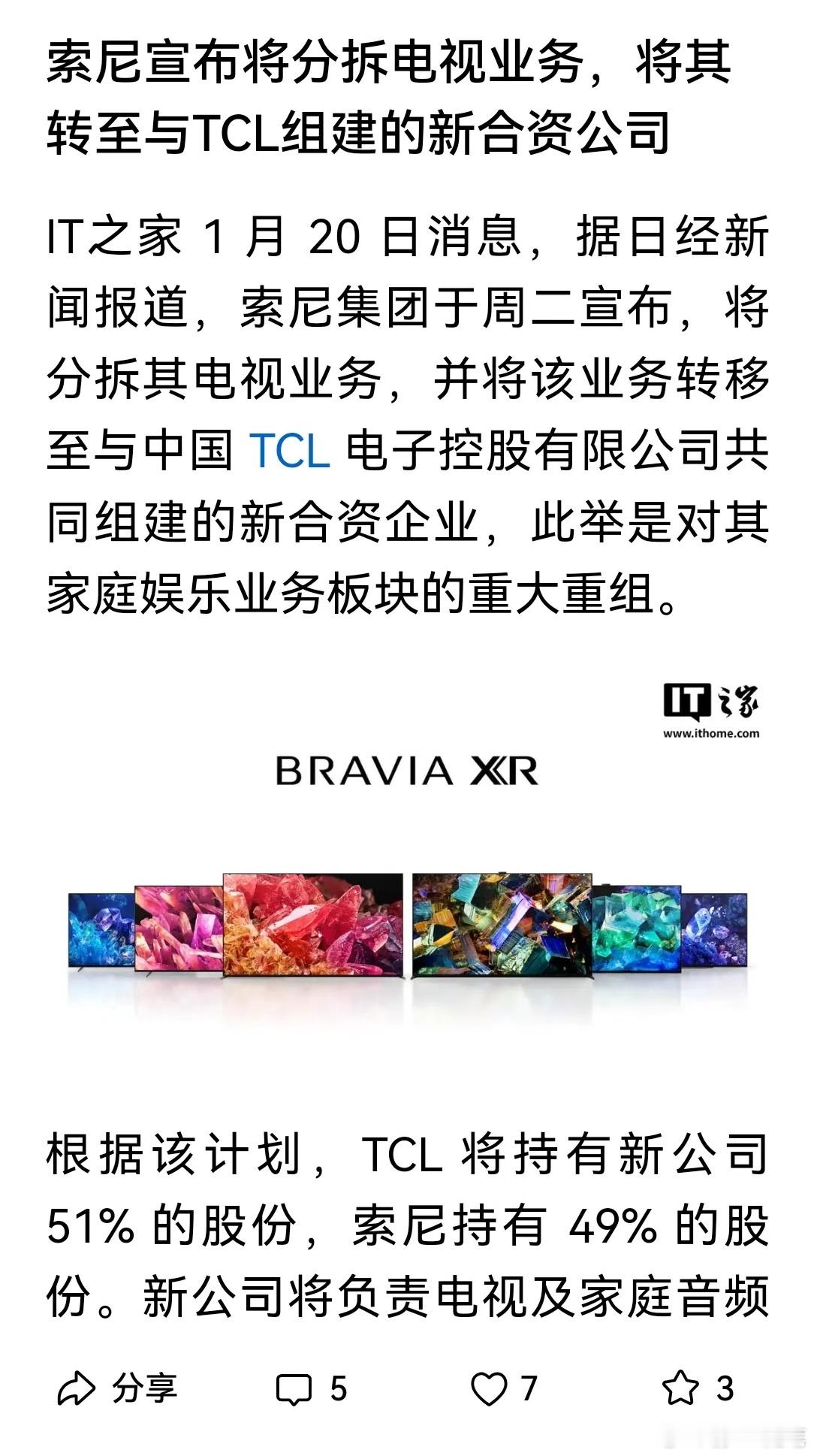 日本电视全军覆没,三四十年前在国人眼里神一样的日本电视品牌一个个被中国公司击败收购。索尼和TCL成立了合资公司,TCL占51%,索尼占49%。也就是说,日本电视机没有控制权了,归中国公司。真是十年河东十年河西啊,这么快日本就没落了。下一个汽车行业要是没落,日本就会大败。。