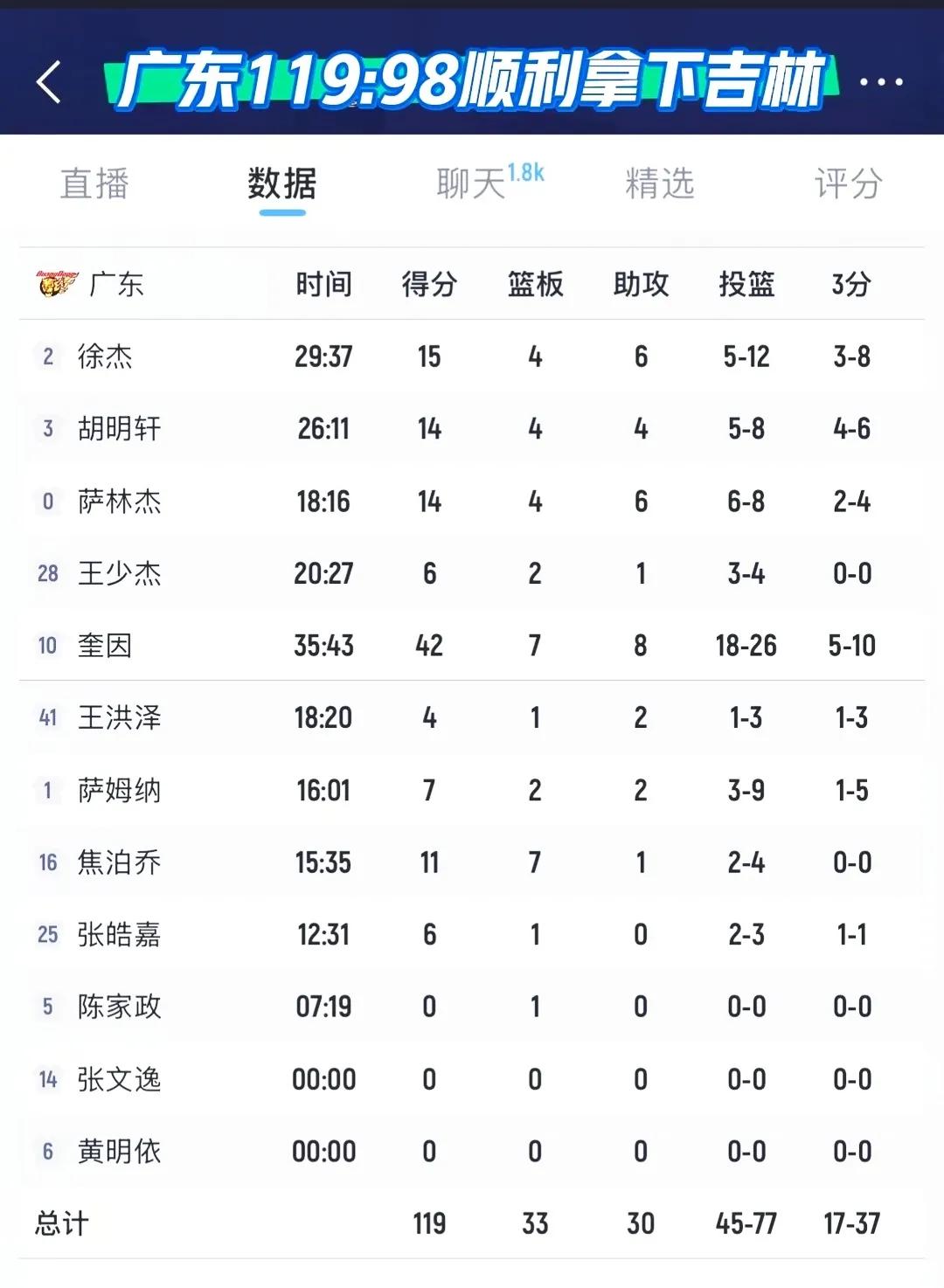 广东客场119-98战胜吉林,119分应该是本赛季到目前为止最高得分,这场比赛全队都打得不错,面对弱队,奎因也是爽了一把。 更令球迷欢喜的是徐杰,胡明轩都状态回升,两人如果都打出来,球队获胜就更轻松了。 其实阿杜这场比赛还是试验阵容,开始都是让徐杰蹲底角的,打不开局面时就让徐杰主控,一切都是为了打山西做准备。 另外,焦泊乔应该没事吧,倒一下地。