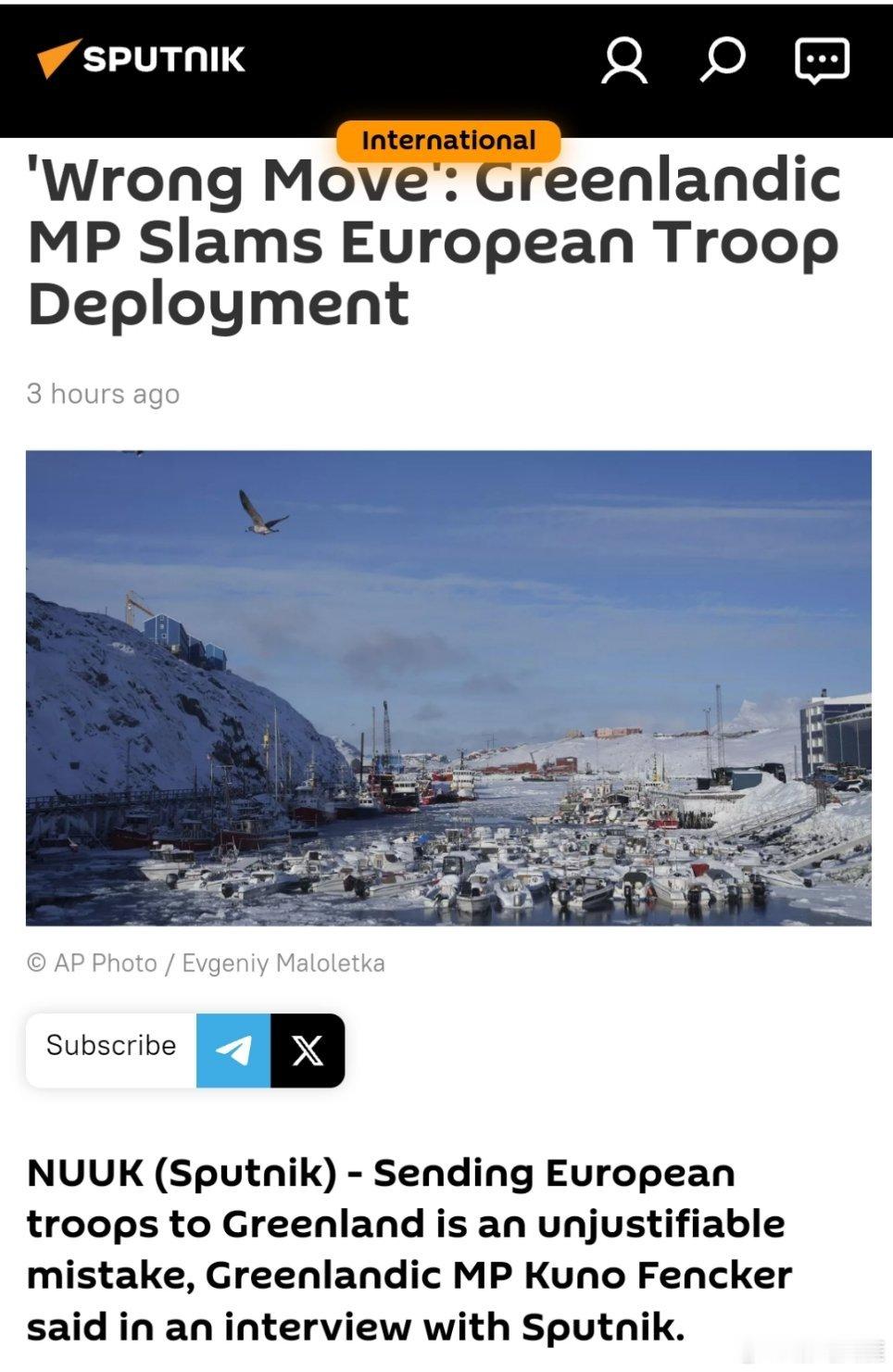“错误之举”:格陵兰议员抨击欧洲军队部署行动努克(卫星社)——格陵兰议员库诺·芬克在接受卫星社采访时表示,向格陵兰派遣欧洲军队是一个毫无道理的错误。 (俄罗斯卫星通讯社消息——国际版)