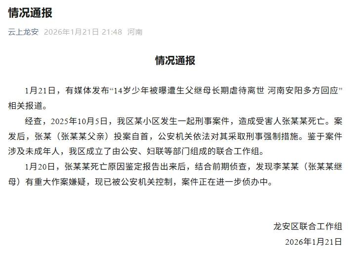 1月21日,有媒体发布“14岁少年被曝遭生父继母长期虐待离世河南安阳多方回应”相关报道。经查,2025年10月5日,我区某小区发生一起刑事案件,造成受害人张某某死亡。案发后,张某(张某某父亲)投案自首,公安机关依法对其采取刑事强制措施。鉴于案件涉及未成年人,我区成立了由公安、妇联等部门组成的联合工作组。1月20日,张某某死亡原因鉴定报告出来后,结合前期侦查,发现李某某(张某某继母)有重大作案嫌疑,现已被公安机关控制,案件正在进一步侦办中。