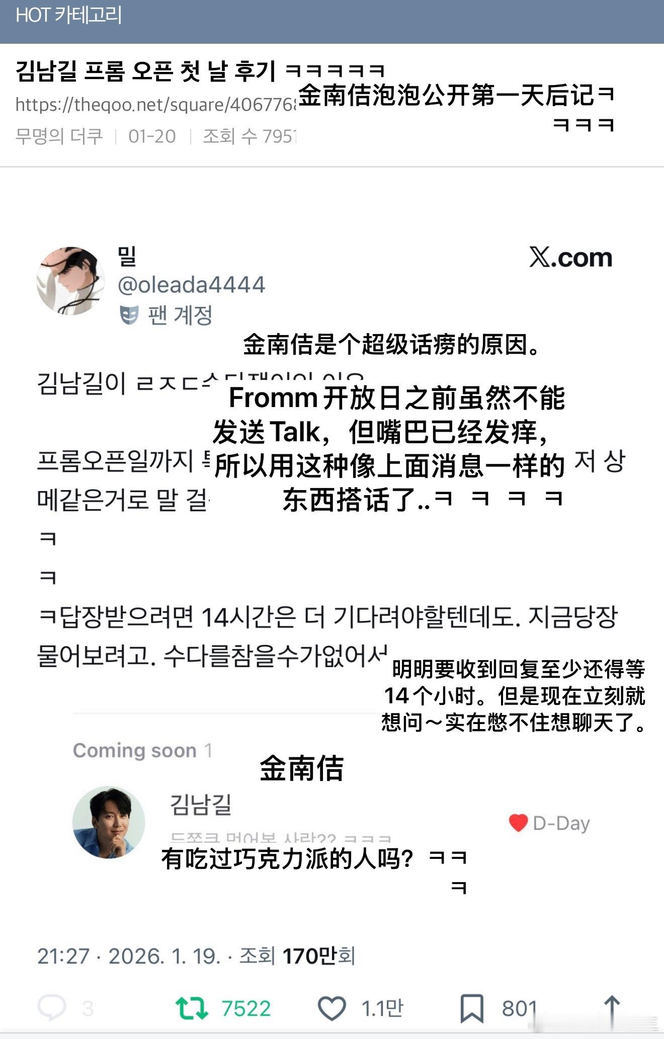 【热帖】金南佶泡泡公开第一天后记ㅋㅋㅋㅋ超级话痨金南佶~因为因为开放日之前不能发送talk但是实在是憋不住要讲话然后直接发送了消息这个记录太逗了他真的好有意思一人儿哈哈哈哈哈哈哈干什么都不能不让哥讲话 还记得他开粉丝见面会唠四五个小时唠的粉丝都想走了的事
