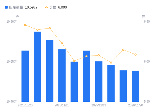 日期A股户数(户)流通A股户均持股数(股)户均持股市值(万元)2026-01-2010593633886.2320.642026-01-0910596133878.2320.842025-12-3110631833764.4820.222025-12-1910652933697.6020.492025-12-1010719233489.1720.332025-11-2810650433705.5120.262025-11-2010727433463.5720.852025-11-1010786633279.9221.372025-10-3110838033122.0821.202025-10-2010719833487.3021.63
