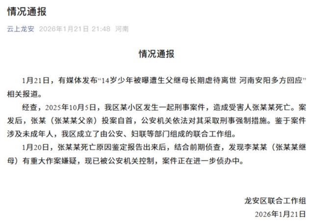 1月21日晚,河南省安阳市龙安区联合工作组通报:1月21日,有媒体发布“14岁少年被曝遭生父继母长期虐待离世河南安阳多方回应”相关报道。