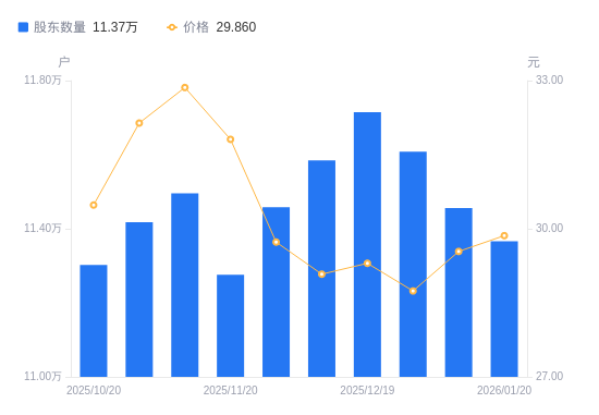 日期A股户数(户)流通A股户均持股数(股)户均持股市值(万元)2026-01-201136654774.0914.262026-01-091145564736.9613.992025-12-311160784674.8513.442025-12-191171454632.2713.572025-12-101158474684.1713.622025-11-281145794736.0114.082025-11-201127544812.6615.312025-11-101149574720.4415.512025-10-311141774752.6815.282025-10-201130214801.2914.63