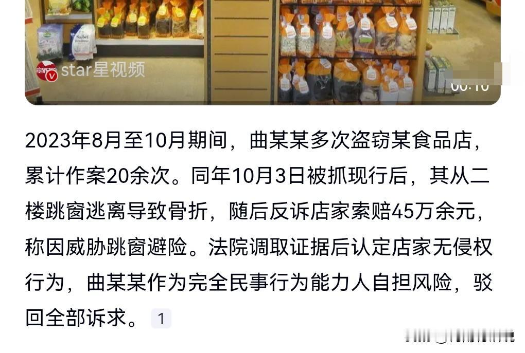 借用老版《三国演义》里面诸葛亮的一句台词。 从未见过如此厚颜无耻之人。 1月21日热搜,男子盗窃被抓,跳窗骨折反索赔45万。 2023年8月至10月间,一男子多次盗窃某食品,竟然达20多次。 这是跟这家店有仇吗?怎么一直偷这家店? 有一次被抓现行了,男子慌不择路跳窗,导致骨折。 他竟然反向店主索赔45万。 也是够厚颜无耻的。 法院肯定不如他的意,驳回了他的全部请求。 真是大快人心啊。 男子盗窃被抓 跳窗骨折反索赔45万
