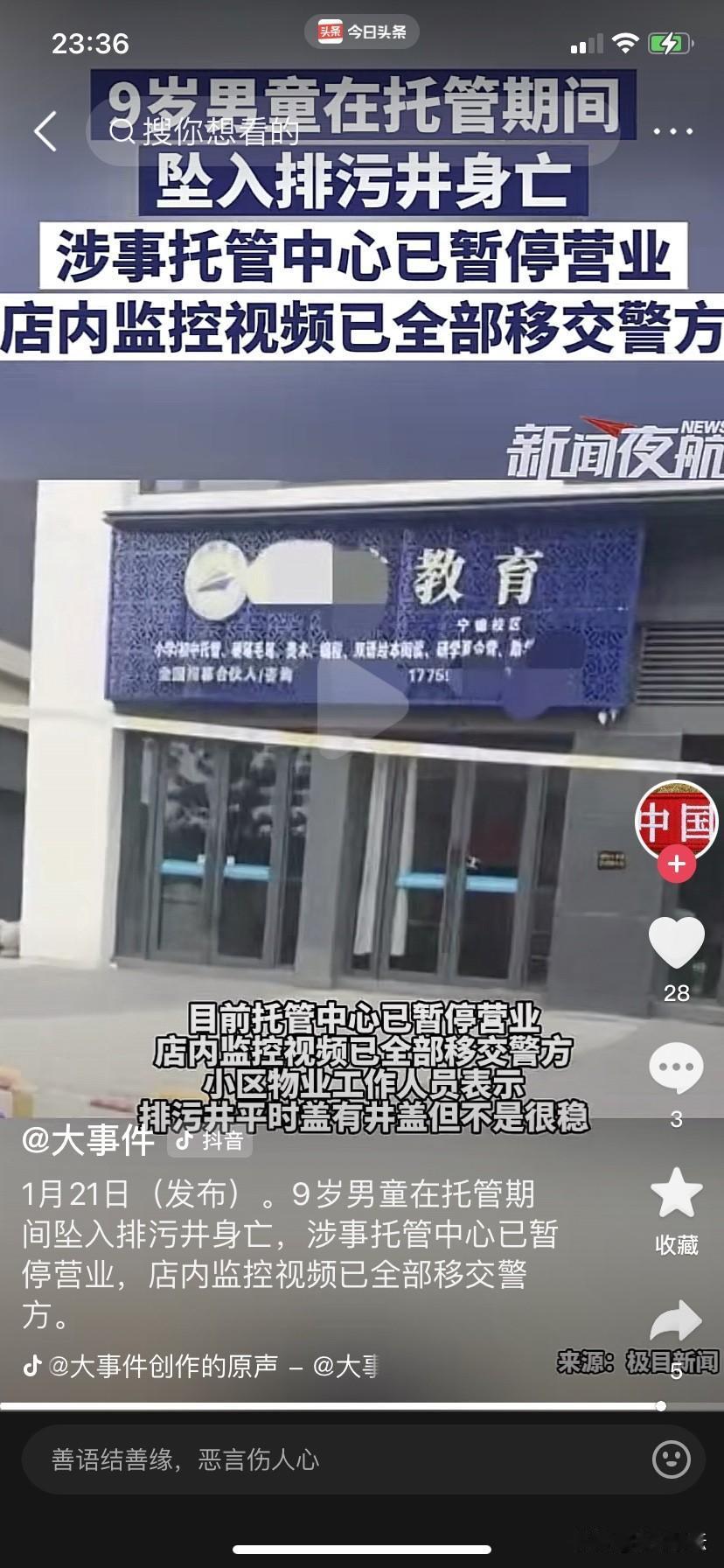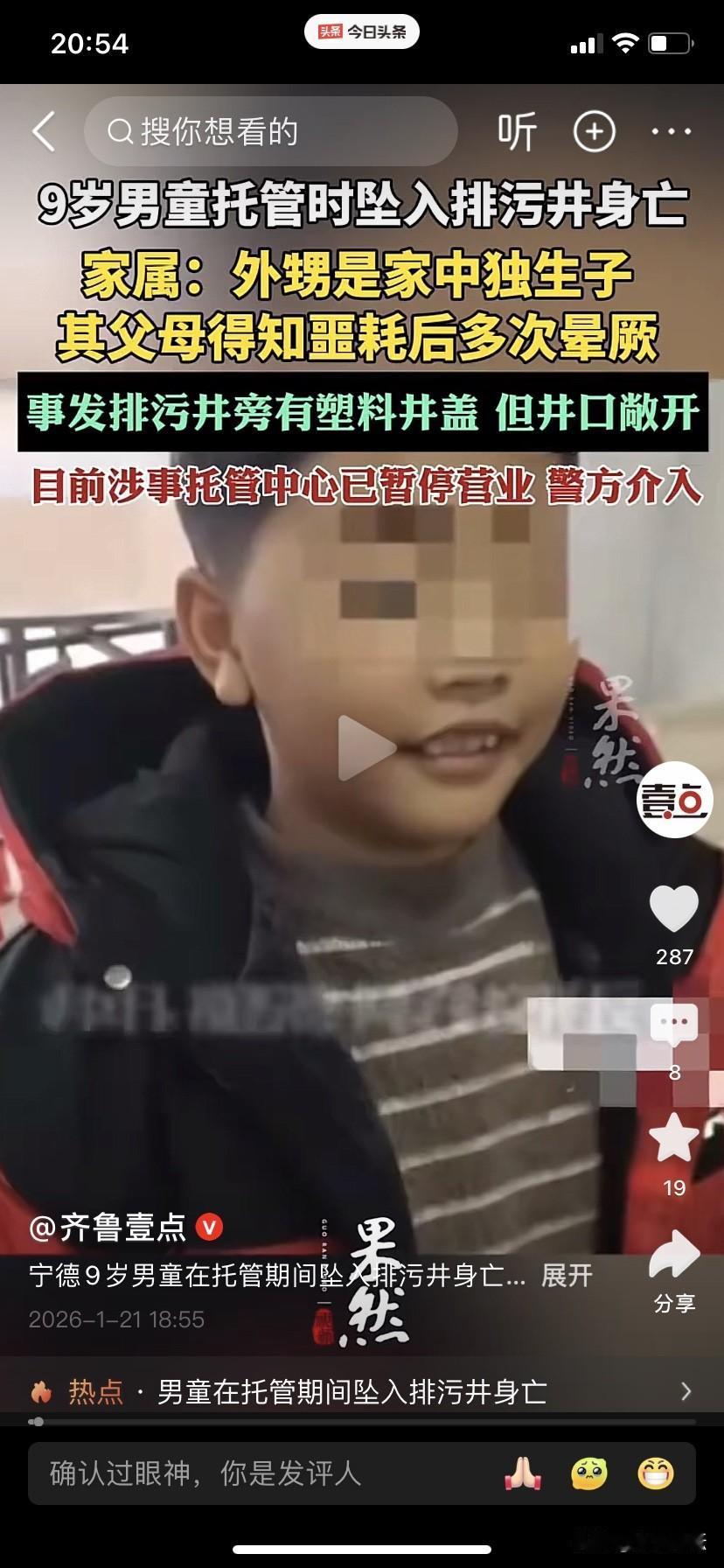 太痛心了,福建九岁男童坠入排污口不幸身亡。 2026年1月19日晚6:40,在福建宁德一个九岁男童在托管期课间玩耍不慎坠入排污井不幸身之。据小孩的家属张女士称,自己九岁的外甥是家中的独自生前在福建蕉城区一家托管所,在1月19日晚6点40分课间休息玩耍时不慎坠入门口草坪约三米深的排污口不幸身亡。孩子的父母得知噩耗后多次痛哭到晕厥。 1月20号上午,家属带记者去事发地时,现场看到排污井口周围杂草丛生,排污井口旁边有塑料井盖,但井口是敞开着的,井口周围未设置任何防护措施与警示标识。 目前,涉事托管中心已暂停营业,警方已经介入调查。 建议所有的排污井内必须安装防护网,不要让悲剧再次发生。[祈祷][祈祷]