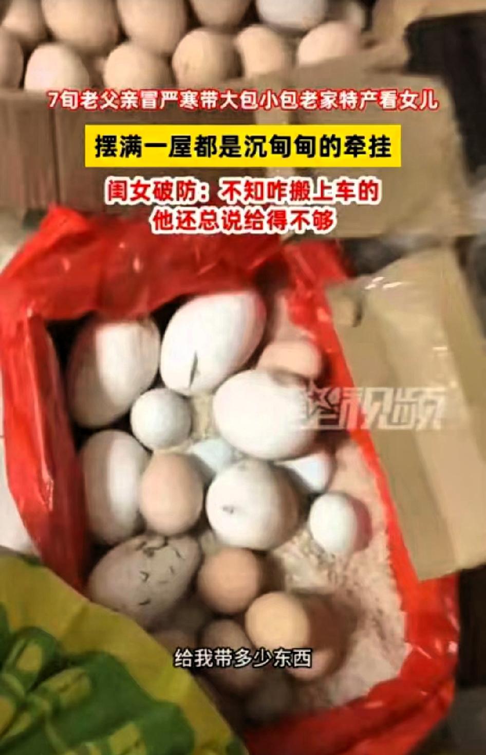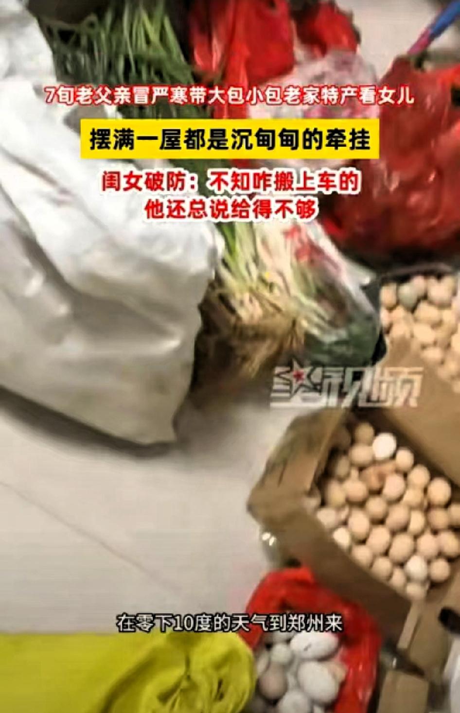 泪目了!河南郑州,近日,一位75岁老父亲在零下10度的天气,竟然从农村坐大巴250多公里给女儿送土产。 女儿毛女士一开始还劝他,天冷路滑,自己年纪也大了,来回折腾太辛苦,说过两天就带着孩子开车回乡下看他。可老爷子没听劝,悄悄托人买好了车票,把家里能拿的东西都收拾妥当,执意要亲自送过来。 当丈夫把老父亲接到家,毛女士打开后备箱的那一刻,瞬间红了眼眶。她原本以为,爸爸顶多就是顺手带几把自家种的青菜,没想到后备箱塞得满满当当:新鲜的时令蔬菜、处理干净的两只土鸡、自家榨的花生油,还有整整200个小心裹好的土鸡蛋。 想想这一路就知道有多不容易,从村里到镇上,再挤上摇摇晃晃的大巴车,老爷子得把这200个鸡蛋护得多仔细,生怕路上颠簸磕破了。这哪是普通的鸡蛋,每一个都裹着父亲怕女儿吃不到家乡味道的牵挂。 父母的爱从来都不是什么豪言壮语,而是藏在这些最朴素的烟火气里。他们总想着把自己手头最好的东西,一股脑地塞给孩子,这些不值钱的土产,在他们眼里,比任何山珍海味都金贵。 这世上最暖的,莫过于父母的碎碎念念,最沉的,莫过于父母不求回报的关爱。零下10度的天气很冷,但这份浓得化不开的亲情,足以抵御所有寒冬。