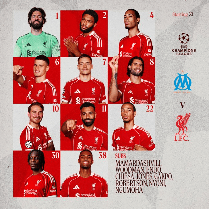 利物浦替补:25-马马尔达什维利、28-伍德曼、26-罗伯逊、3-远藤航、17-琼斯、42-尼奥尼、14-基耶萨、18-加克波、73-恩古莫哈