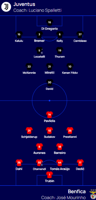 尤文图斯首发:16-迪格雷戈里奥、15-卡卢卢、3-布雷默、6-劳埃德-凯利、27-坎比亚索、5-洛卡特利、19-凯夫伦-图拉姆、22-麦肯尼、21-米雷蒂、10-伊尔迪兹、30-乔纳森-戴维