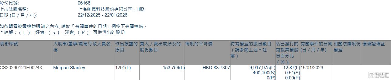 格隆汇1月22日丨根据联交所最新权益披露资料显示,2026年1月16日,剑桥科技(06166.HK)遭MorganStanley在场内以每股均价83.7307港元减持好仓15.38万股,涉资约1287.43万港元。