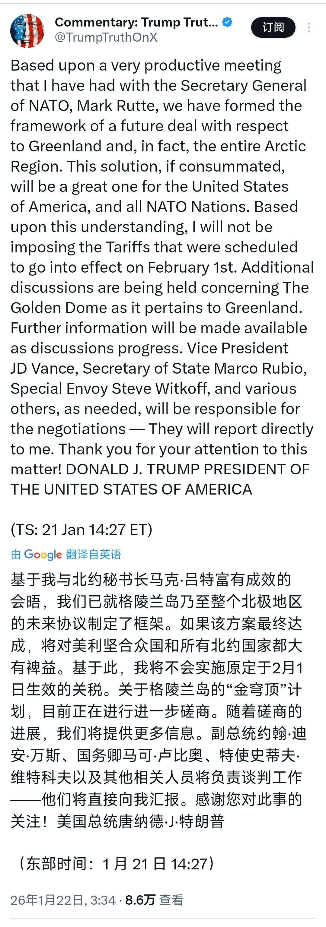 突发新闻:特朗普宣布,他不会按原计划于2月1日对丹麦、英国、法国、德国、荷兰、瑞典和芬兰加征关税。 特朗普今天(北京时间1月22日)写道:“基于我与北约秘书长马克·吕特的一次非常富有成效的会谈,我们已经为一个关于格陵兰及整个北极地区的未来协议搭建了框架。如果这一方案最终落地,这将对美利坚合众国以及所有北约国家来说都是一件非常棒的事。基于这一理解,我将不会实施原定于2月1日生效的关税。关于‘金穹’项目在格陵兰相关事宜,我们正在进行进一步讨论。随着对话推进,会公布更多信息。副总统JD·万斯、国务卿马尔科·鲁比奥、特使史蒂夫·威特科夫以及其他相关人士,将根据需要负责谈判——他们将直接向我汇报。” [机智]评几句:在特朗普看来,这个世界就是他的舞台,他想咋滴就咋滴……特朗普的这番发文,活脱脱将全球地缘政治舞台变成了他的个人秀场,尽显其随心所欲、予取予求的霸权做派。他动辄挥舞关税大棒威胁欧洲盟友,又仅凭一场会谈便轻易收回制裁,看似是外交博弈的“成果”,实则是将国际规则、盟友关系当作可以随意摆弄的棋子,完全按自己的意志操控局势走向。格陵兰与北极议题成了他满足自身地缘野心的筹码,关税的收与放全凭其个人私利定夺,所谓的“协议框架”不过是他强权施压下的妥协产物,甚至要求谈判团队直接向其一人汇报,更是将独断专行刻到极致。在特朗普眼中,世界就是他肆意妄为的舞台,没有规则束缚,没有盟友平等,只有他的一己之私,这种蛮横的单边主义,不仅撕裂了北约同盟的根基,更让国际社会看清了美国霸权的虚伪与霸道。