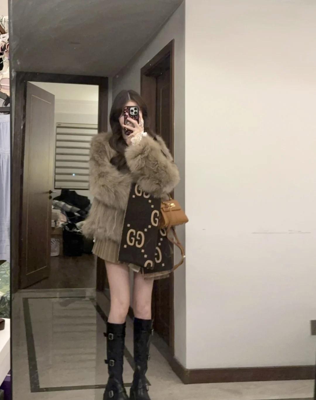 毛绒外套裹住了所有怕冷的小情绪,百褶裙又偷偷藏着少女心,焦糖色包包和老花围巾是氛