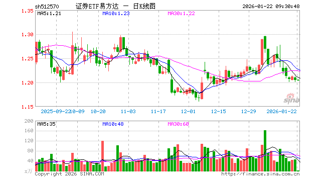 1月22日,证券ETF易方达(512570)开盘涨0.00%,报1.205元。证券ETF易方达(512570)重仓股方面,东方财富开盘涨0.00%,中信证券跌0.14%,国泰海通涨0.20%,华泰证券涨0.26%,广发证券跌0.04%,招商证券涨0.06%,东方证券涨0.19%,申万宏源涨0.20%,兴业证券涨0.15%,中金公司跌0.31%。