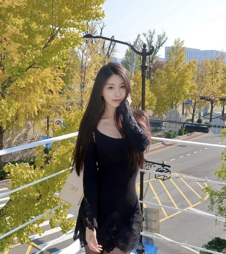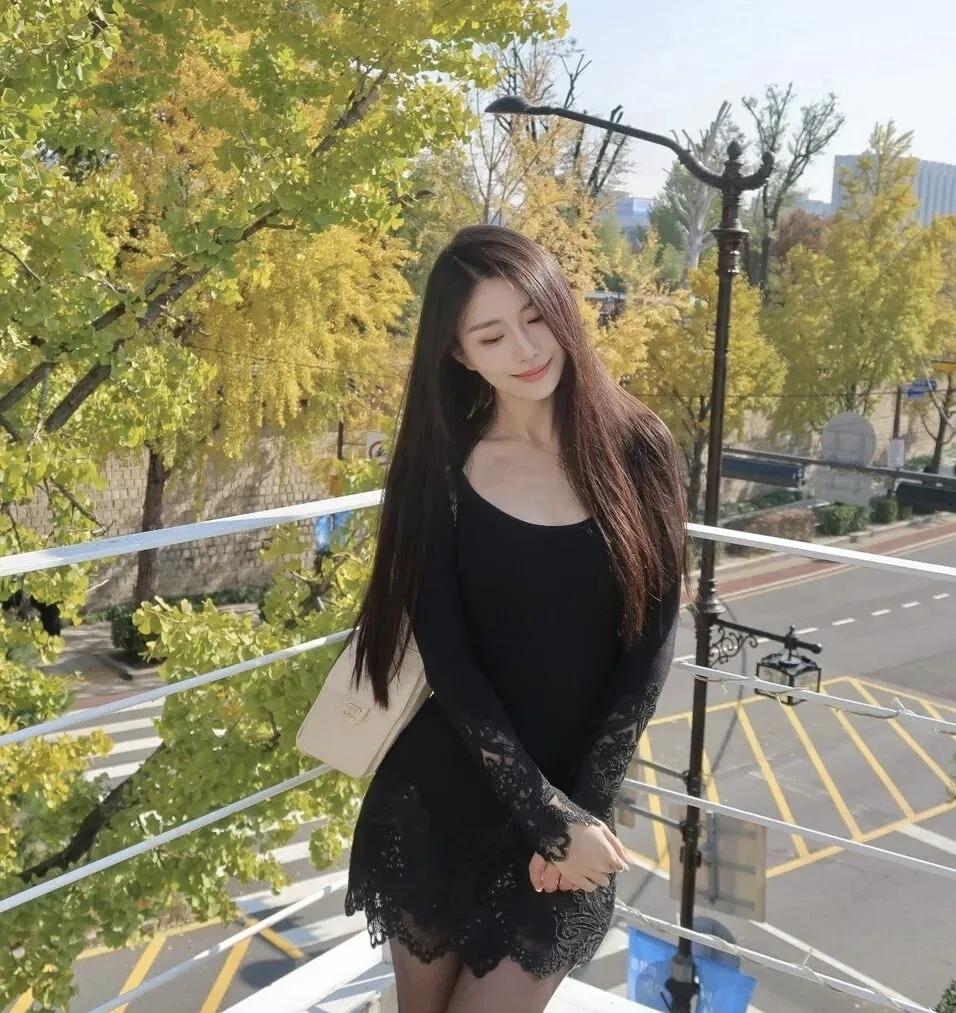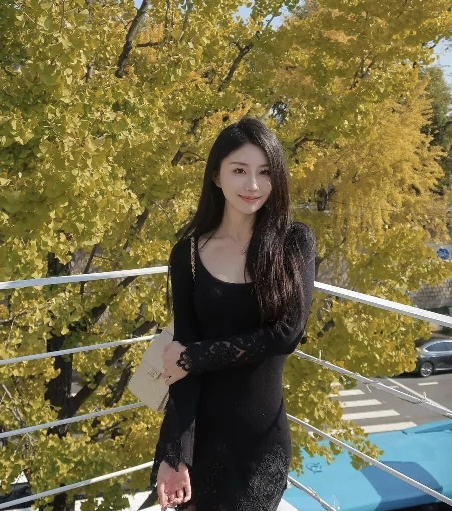 阳光穿过满树金黄的银杏叶,在黑色针织衫上落下细碎光斑。今日份的松弛感,是街角的秋意和肩上的米白包包给的。