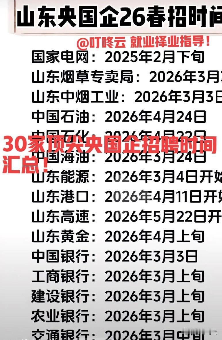 山东顶级招聘汇总!30家央国企最新招聘时间合集!速收藏起来备用!山东顶尖企业,好岗位全都在这里!2月下旬开始大规模筛选简历,后开始笔试、面试流程!@叮咚云 优选推荐:国家电投、山东烟草、中烟工业、山东重工、山东黄金、山东高速、山东港口、山东机场集团、浪潮集团、中国移动山东公司、青岛银行、齐鲁银行等等公司,只要能上岸一家,安安稳稳能干的退休,真是铁饭碗!速速围观揭秘详细内容!心动不如行动,快来参加吧![点亮平安灯][点亮平安灯][赞][赞] 欢迎关注@叮咚云 将优先为粉丝职业规划指导,1对1咨询是付费服务,为你定制最适合的就业择业方案!欢迎留言交流讨论。[来看我][来看我] 免责声明:图片来自网络,仅供参考!