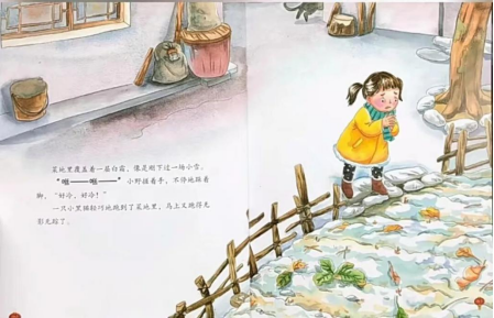 菜地里覆盖着一层白霜,像是刚下过一场小雪。“咝——咝——”小野搓着手,不停地跺着脚,“好冷,好冷!”一只小黑猫轻巧地跑到了菜地里,马上又跑得无影无踪了。一只小麻雀歪着脑袋停在电线杆上。小野仰着头看它。它低着头瞅小野......